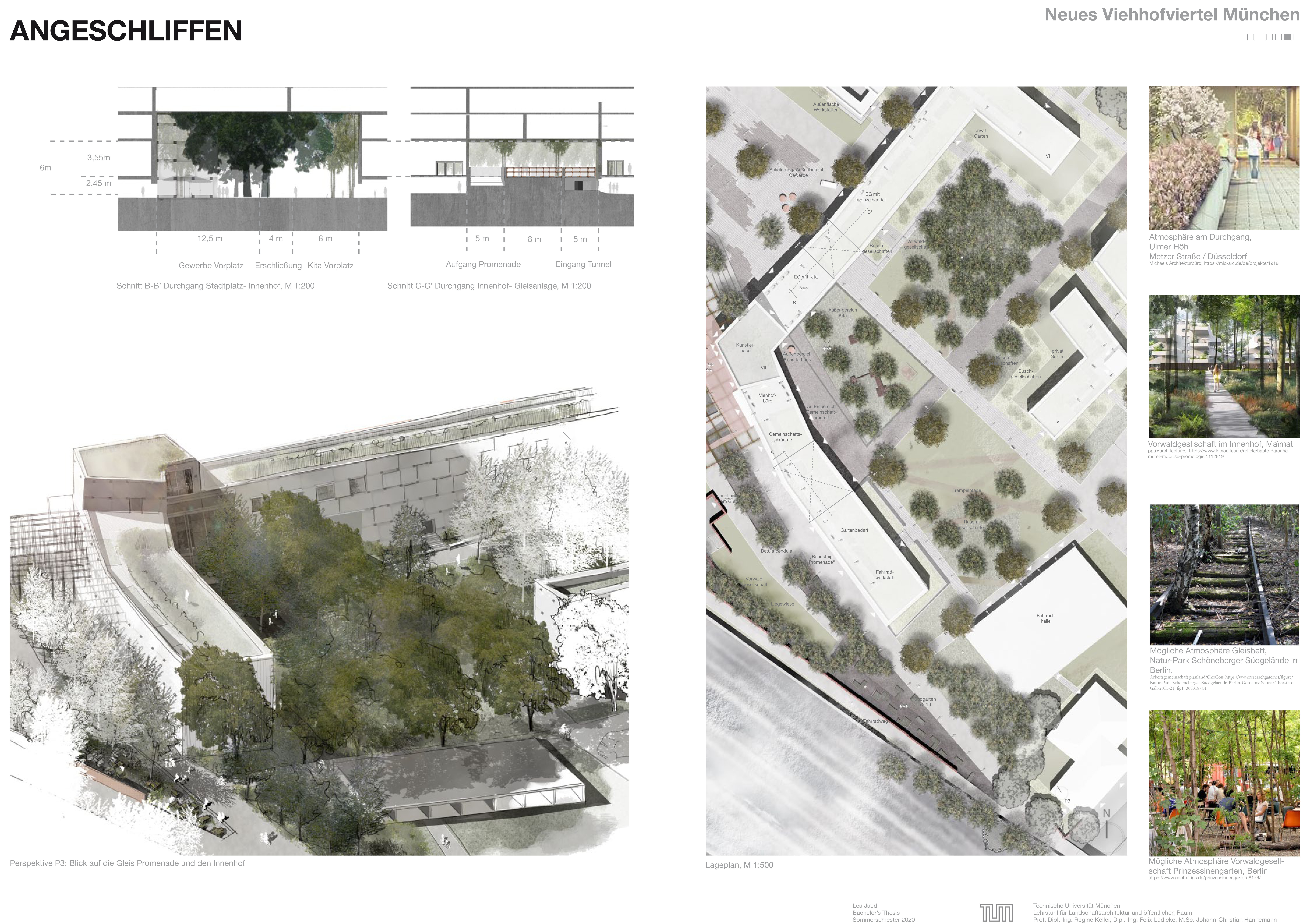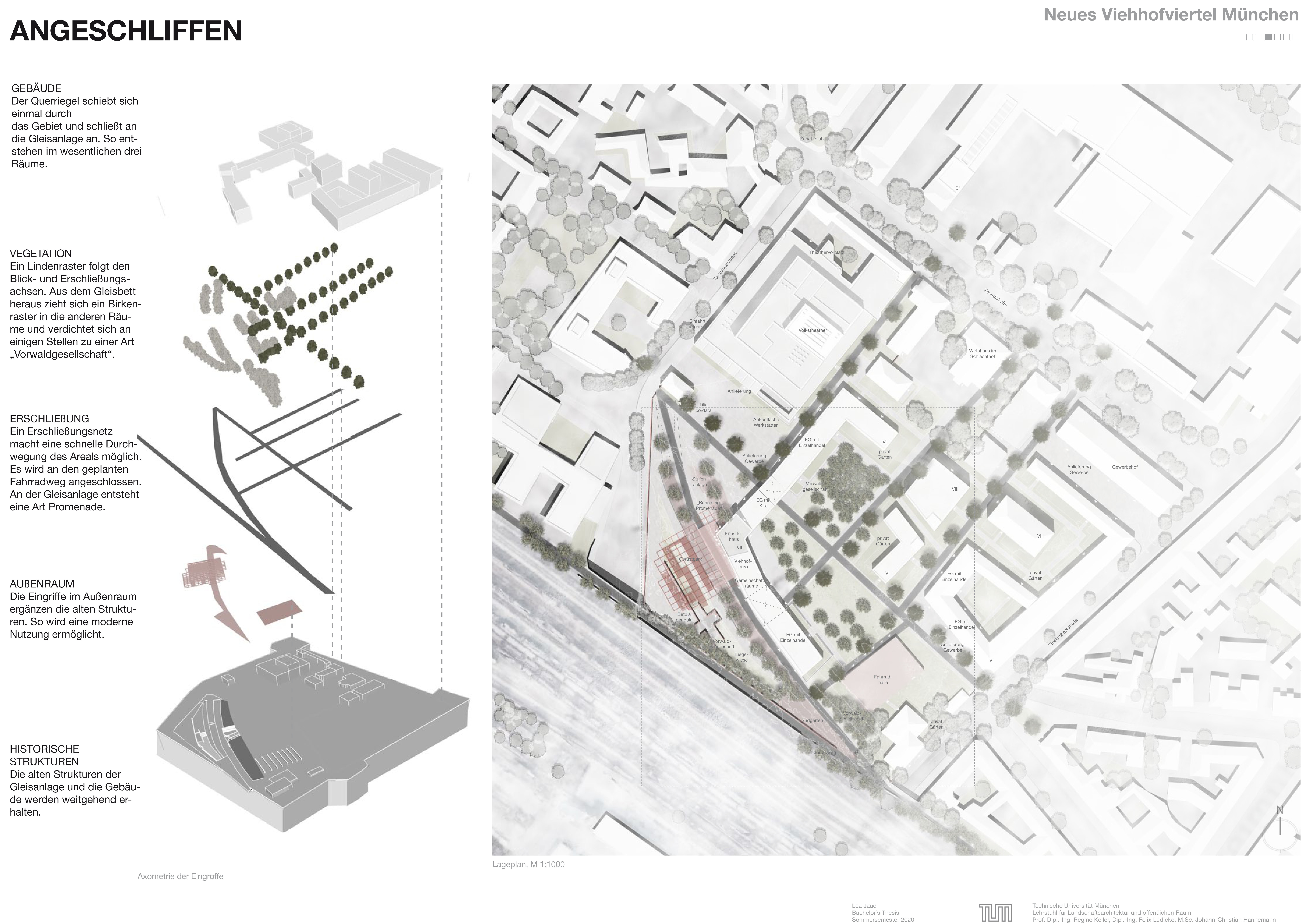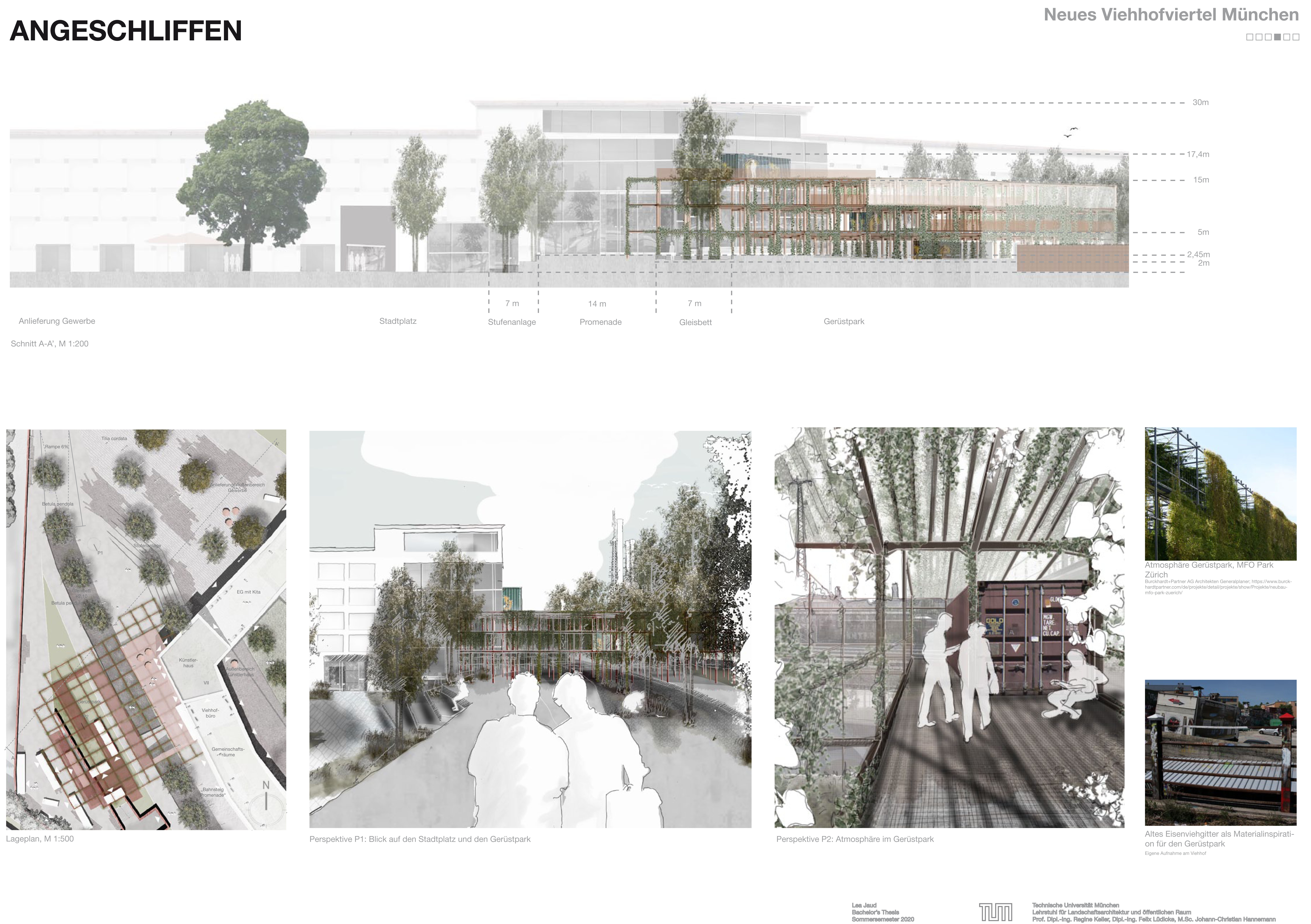 Die alten Strukturen der Gleisanlage und die Gebäude werden weitgehend erhalten. Sie werden durch die Maßnahmen im Außenraum in eine neue Nutzung überführt. So finden beispielsweise Akteure des ehemaligen Bahnwärter Thiels Platz im neuen Gerüstpark. Ein Erschließungsnetz macht eine schnelle Durchwegung des Areals möglich. Dieses wird an den geplanten Fahrradweg entlang der Gleise angeschlossen. An der alten Gleisanlage entsteht eine Art Promenade. Dem Erschließungsnetz folgt ein Lindenraster. Ergänzt wird es durch Birkenreihen, welche sich aus dem Gleisbett in die angrenzenden Räume ziehen. An einigen Stellen verdichten sich die Birkenreihen und werden zu einer Art „Vorwaldgesellschaft“. Im Gegensatz zum Masterplan wird der Blockrand, des mittleren Hofes geöffnet, um mehr öffentlichen Raum zu schaffen. Das Gebäude schiebt sich nun einmal durch das Gebiet und schließt an die Gleisanlage an. So entstehen im Wesentlichen drei Räume: Ein urbaner Platz, eine Grünanlage und der verbindende Gleispark.