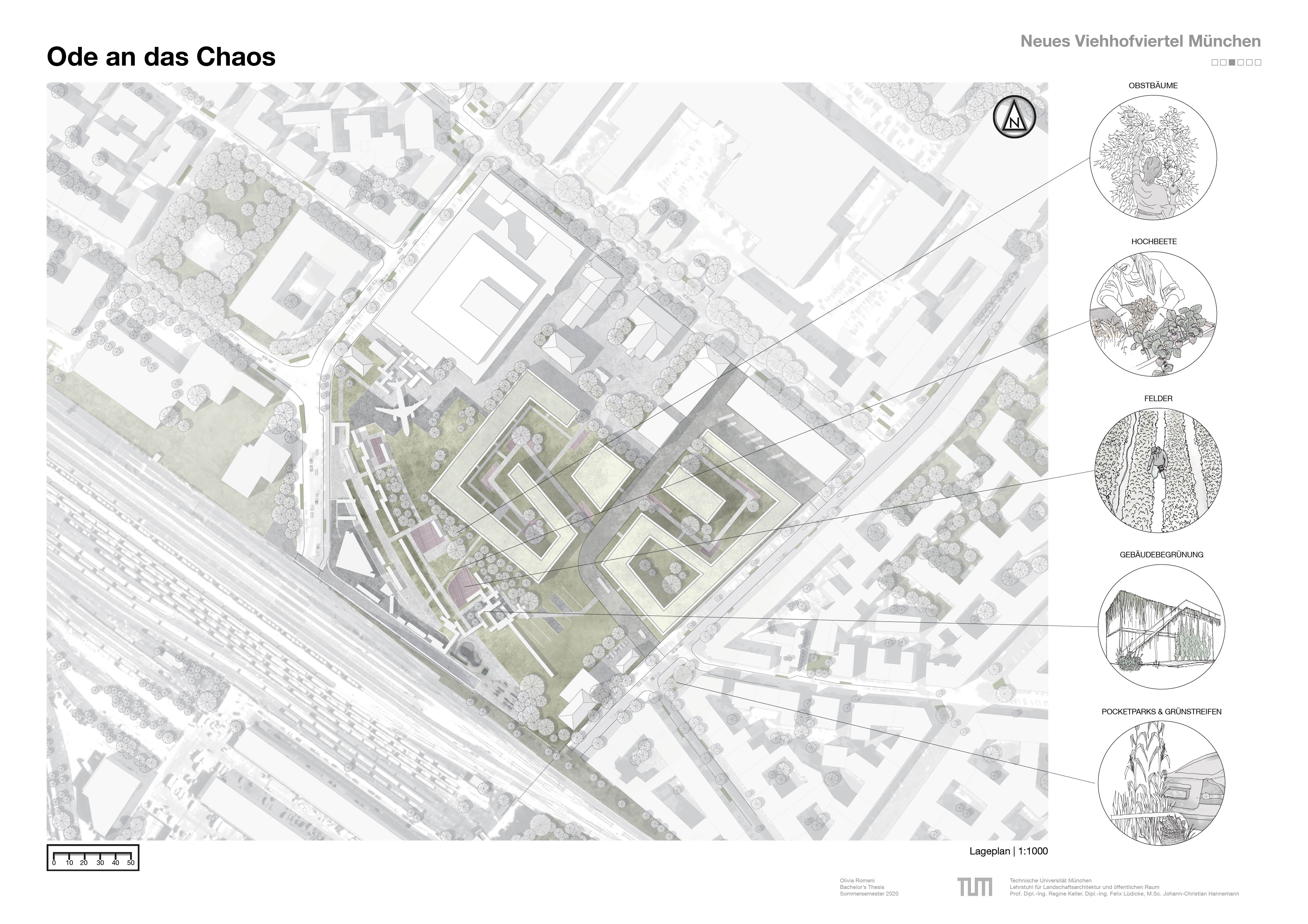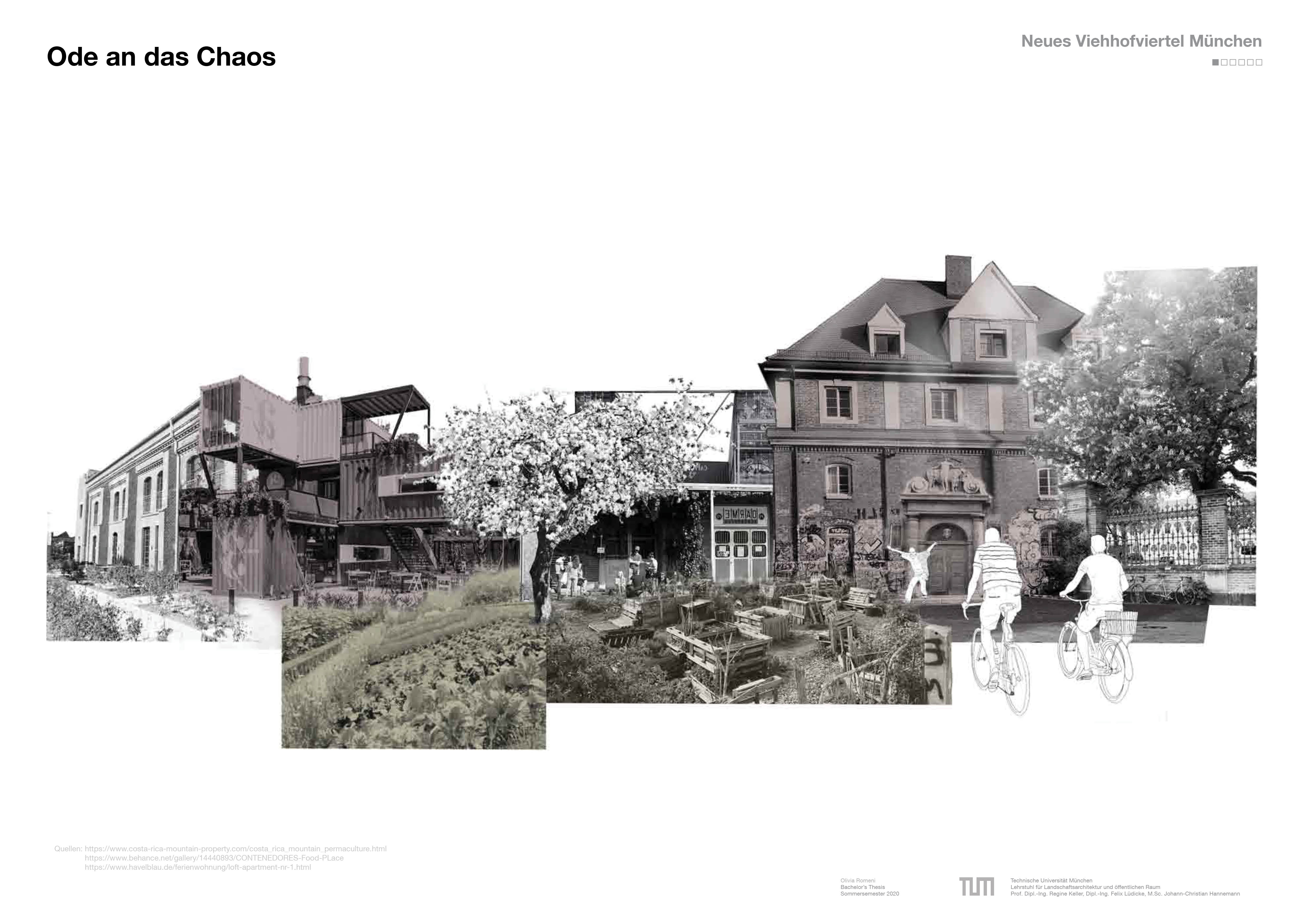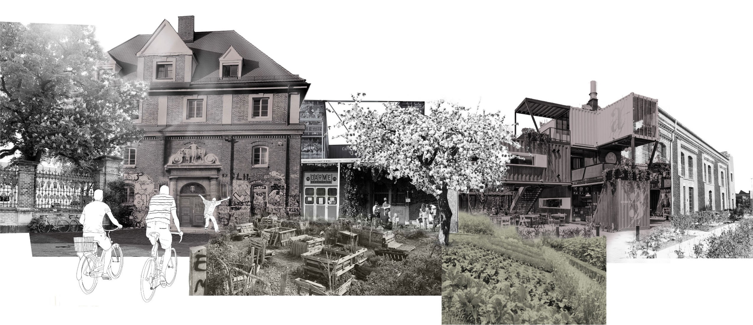 Durch Veränderungen des Kontextes und den Zuzug neuer Bewohner, müssen neue Nutzungen, Strukturen und Ansätze eingegliedert, aber auch Schutz der schon vorhandenen Nutzer gewährleistet werden. Das neue Quartier bildet einen statischen Pol der Ordnung. Der Gegenpol ist der Bahnwärter, von dem momentan alle subkulturellen Qualitäten ausgehen. Diese Funktion als Epizentrum einer auflockernden Dynamik wird im Entwurf verstärkt, wodurch beide Pole ineinander diffundieren und das neue Quartier aufgelockert wird. So entwickelt es eine eigene Identität, die über die Grenzen des Viehhofes ins Stadtviertel hinaus rankt. Das Viehhof Areal, welches früher als grauer, industrieller Ort der nationalen Nahrungsproduktion negativ konnotiert war, entwickelt sich zu einer grünen Großstadtoase, in der Raum für soziale Interaktion an Freiflächen und subkulturellen Strukturen aufgehängt ist. Durch Gefüge wie urban und guerilla gardening entsteht ein essbares Viertel mit ökologischem Wert. Dies schafft Verbindung zum Ursprung des Quartiers, wodurch das einfache Neubauviertel zum Viehhofquartier mit Kulturpark wird. Der Bahnwärter in seiner Rolle als Großstadtoase und Paradebeispiel für Subkultur soll erhalten bleiben und als Ursprung und Anknüpfpunkt weiterer subkultureller Entwicklungen dienen. Es entsteht ein Zusammenspiel von halböffentlich und öffentlich, neu und alt, sowie formell und informell.