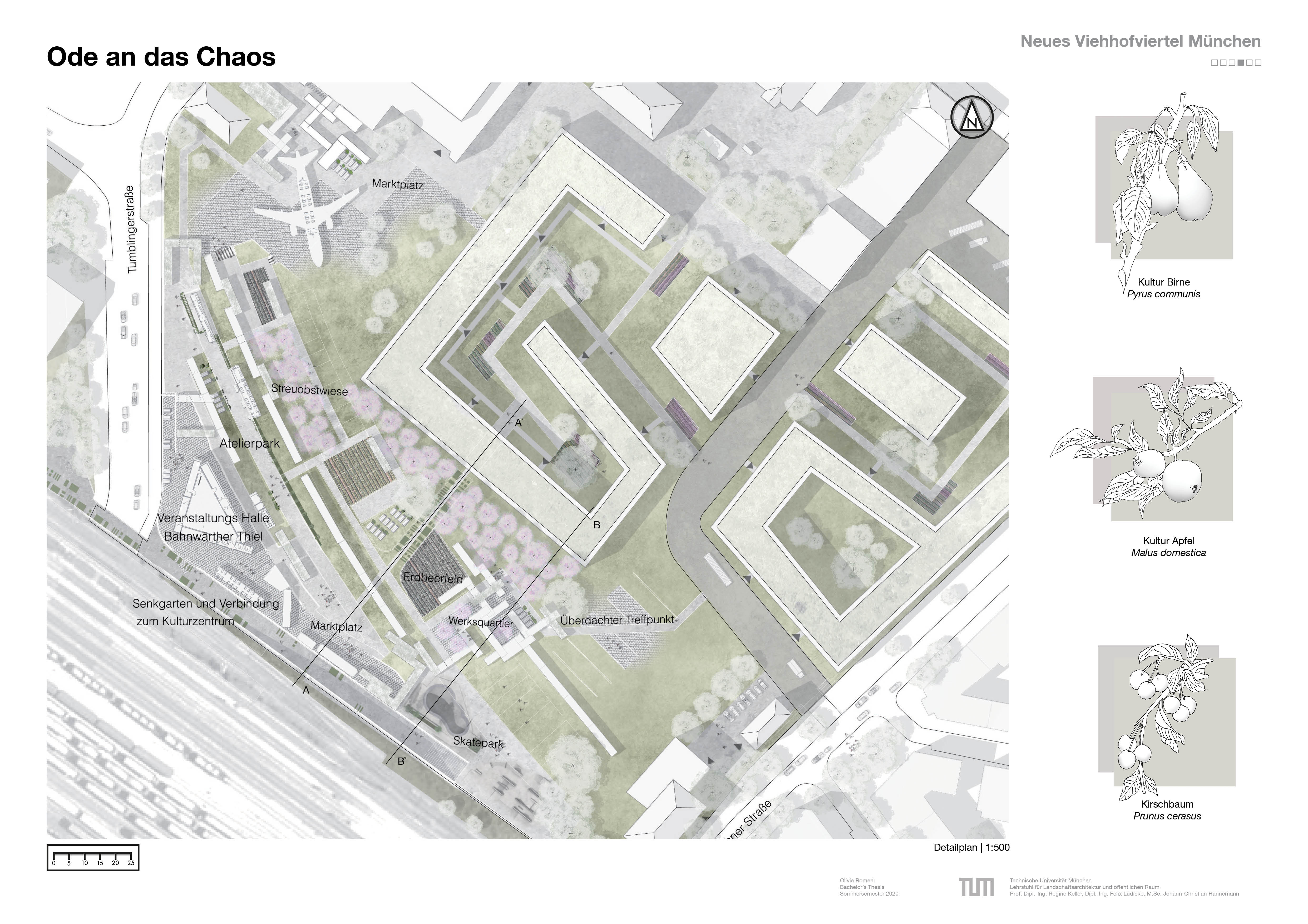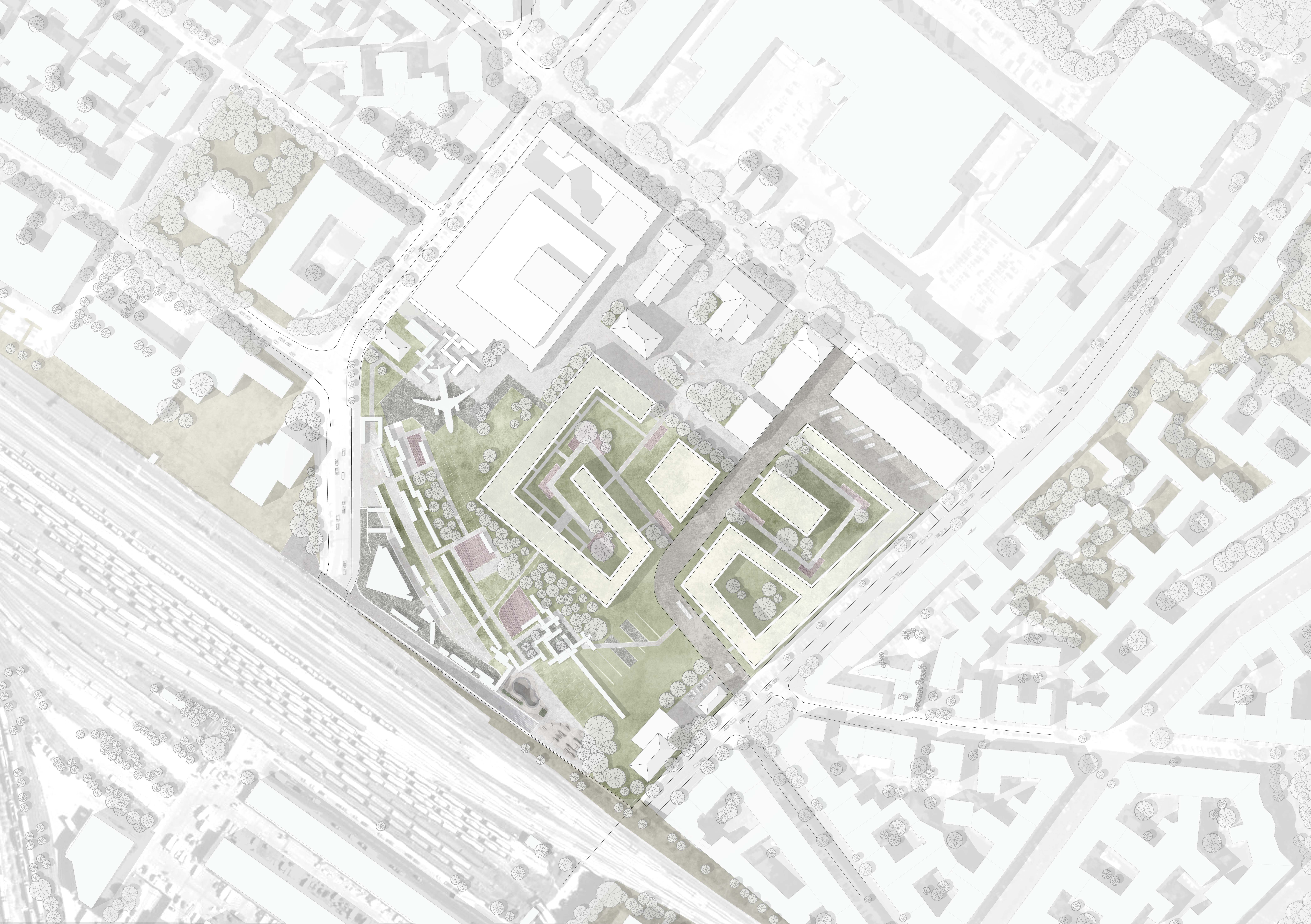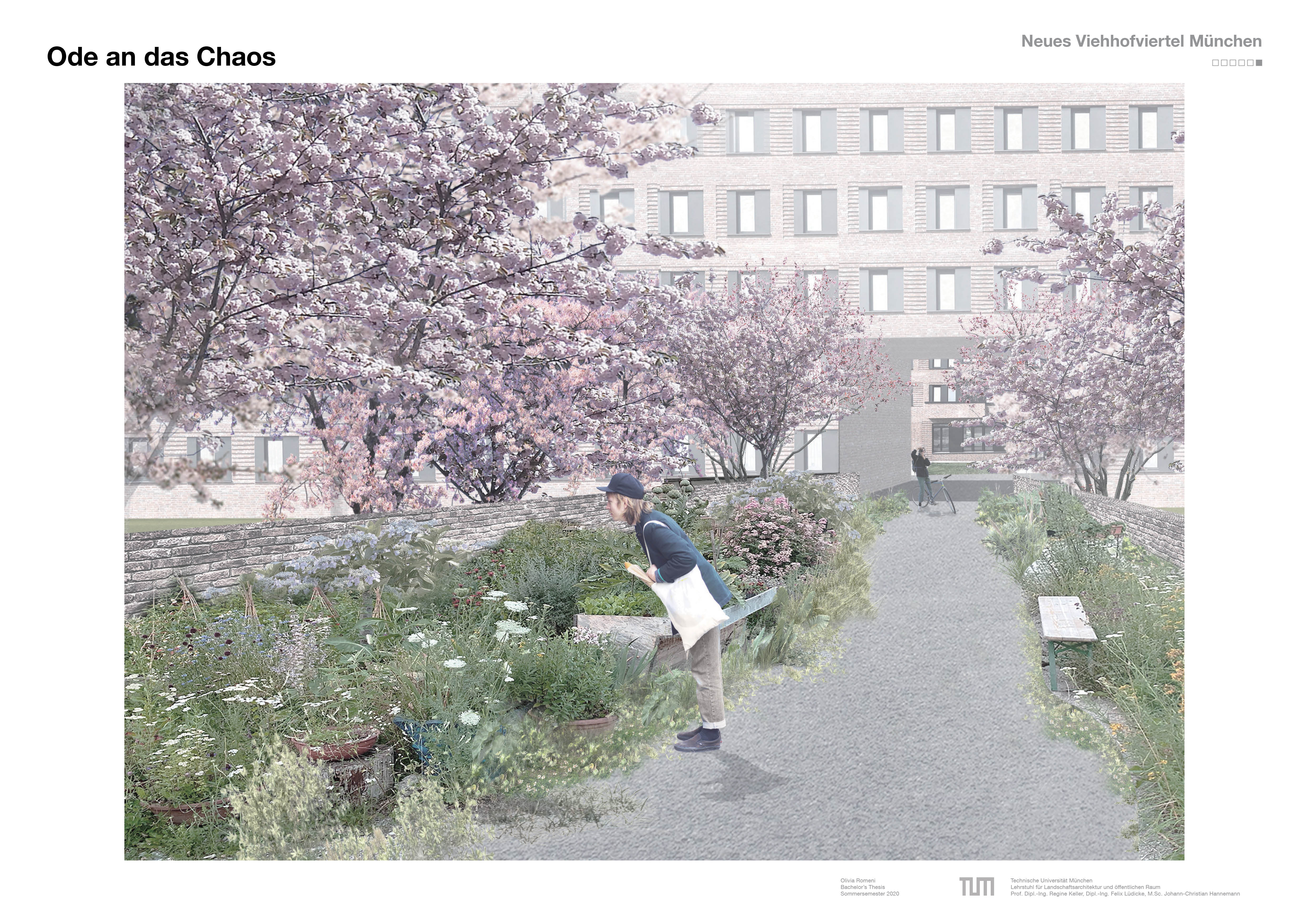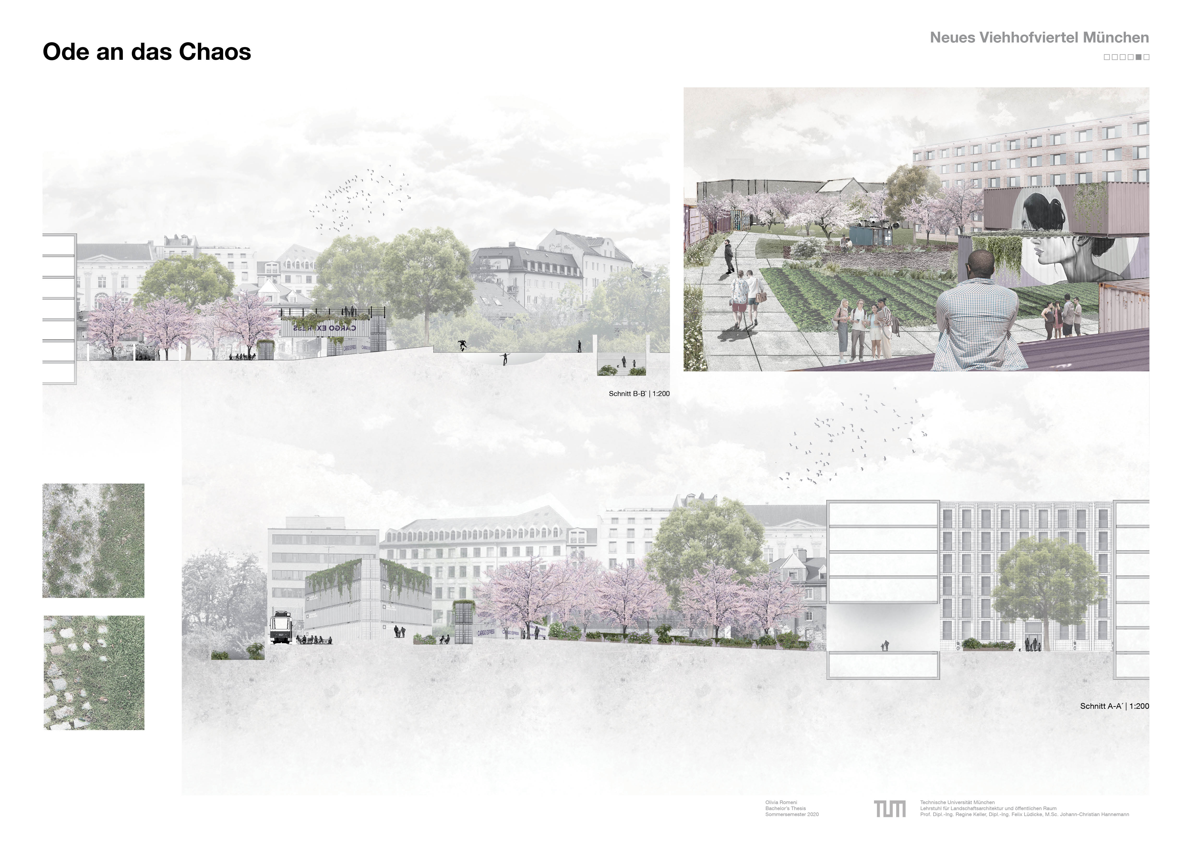 Durch Veränderungen des Kontextes und den Zuzug neuer Bewohner, müssen neue Nutzungen, Strukturen und Ansätze eingegliedert, aber auch Schutz der schon vorhandenen Nutzer gewährleistet werden. Das neue Quartier bildet einen statischen Pol der Ordnung. Der Gegenpol ist der Bahnwärter, von dem momentan alle subkulturellen Qualitäten ausgehen. Diese Funktion als Epizentrum einer auflockernden Dynamik wird im Entwurf verstärkt, wodurch beide Pole ineinander diffundieren und das neue Quartier aufgelockert wird. So entwickelt es eine eigene Identität, die über die Grenzen des Viehhofes ins Stadtviertel hinaus rankt. Das Viehhof Areal, welches früher als grauer, industrieller Ort der nationalen Nahrungsproduktion negativ konnotiert war, entwickelt sich zu einer grünen Großstadtoase, in der Raum für soziale Interaktion an Freiflächen und subkulturellen Strukturen aufgehängt ist. Durch Gefüge wie urban und guerilla gardening entsteht ein essbares Viertel mit ökologischem Wert. Dies schafft Verbindung zum Ursprung des Quartiers, wodurch das einfache Neubauviertel zum Viehhofquartier mit Kulturpark wird. Der Bahnwärter in seiner Rolle als Großstadtoase und Paradebeispiel für Subkultur soll erhalten bleiben und als Ursprung und Anknüpfpunkt weiterer subkultureller Entwicklungen dienen. Es entsteht ein Zusammenspiel von halböffentlich und öffentlich, neu und alt, sowie formell und informell.