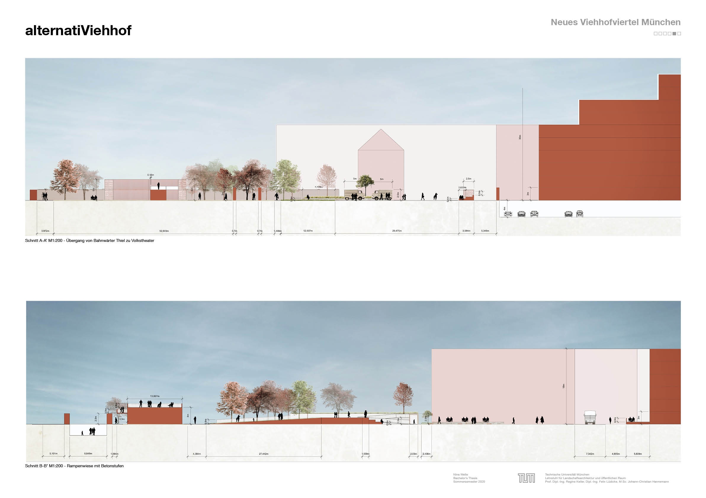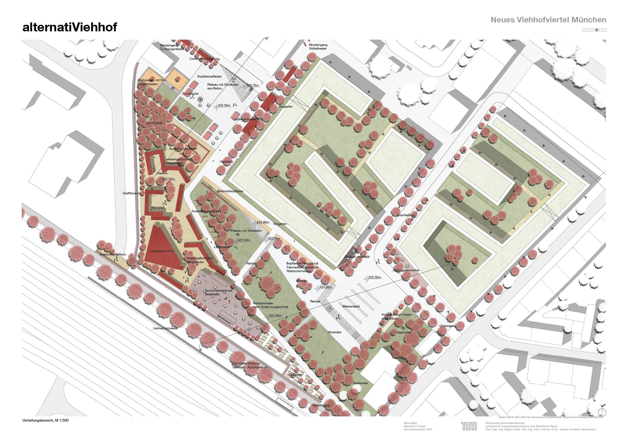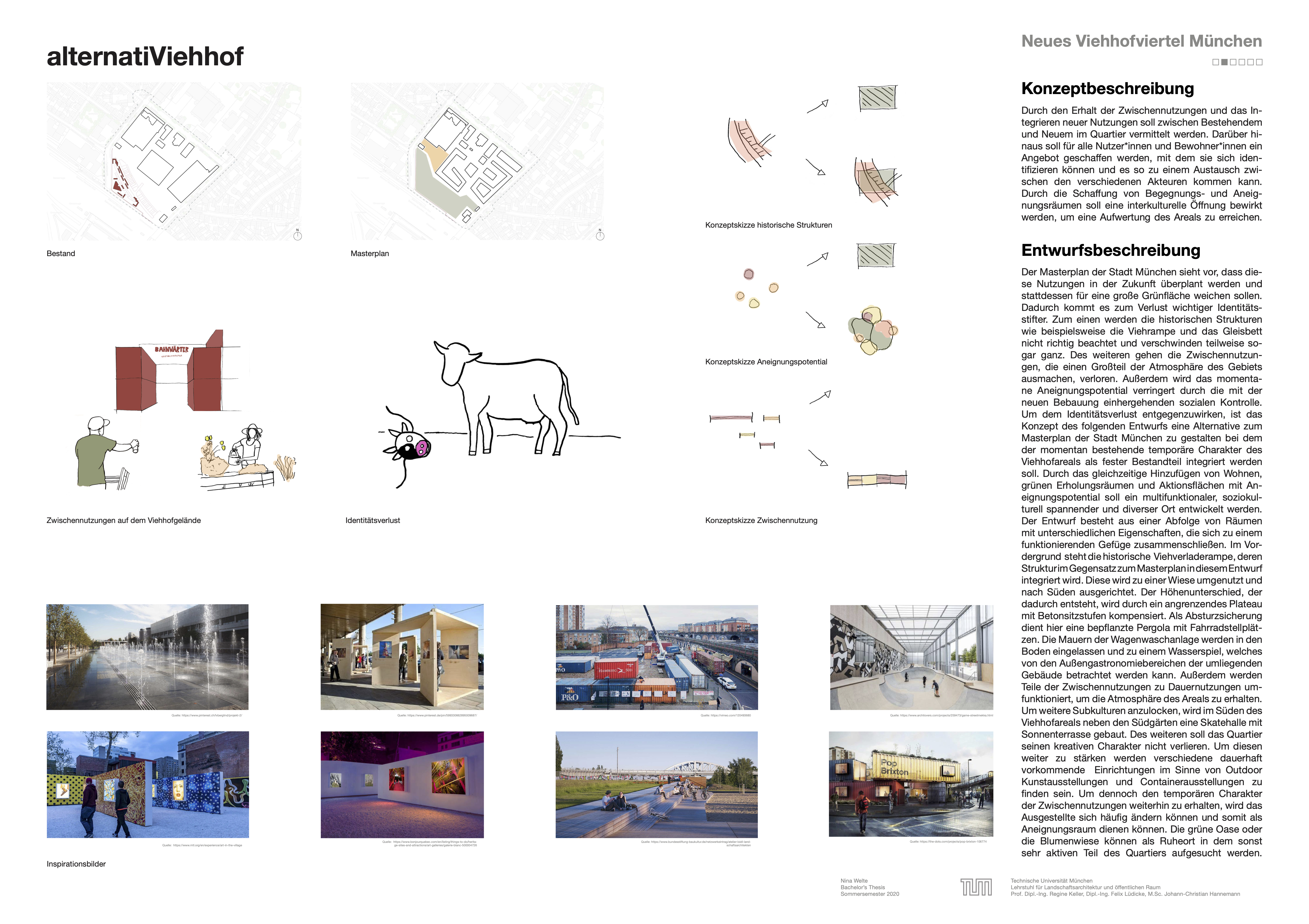 Der Masterplan der Stadt München sieht vor, dass diese Nutzungen in der Zukunft überplant werden und stattdessen für eine große Grünfläche weichen sollen. Dadurch kommt es zum Verlust wichtiger Identitätsstifter. Zum einen werden die historischen Strukturen wie beispielsweise die Viehrampe und das Gleisbett nicht richtig beachtet und verschwinden teilweise sogar ganz. Des weiteren gehen die Zwischennutzungen, die einen Großteil der Atmosphäre des Gebiets ausmachen, verloren. Außerdem wird das momentane Aneignungspotential verringert durch die mit der neuen Bebauung einhergehenden sozialen Kontrolle. Um dem Identitätsverlust entgegenzuwirken, ist das Konzept des folgenden Entwurfs eine Alternative zum Masterplan der Stadt München zu gestalten bei dem der momentan bestehende temporäre Charakter des Viehhofareals als fester Bestandteil integriert werden soll. Durch das gleichzeitige Hinzufügen von Wohnen, grünen Erholungsräumen und Aktionsflächen mit Aneignungspotential soll ein multifunktionaler, soziokulturell spannender und diverser Ort entwickelt werden.
