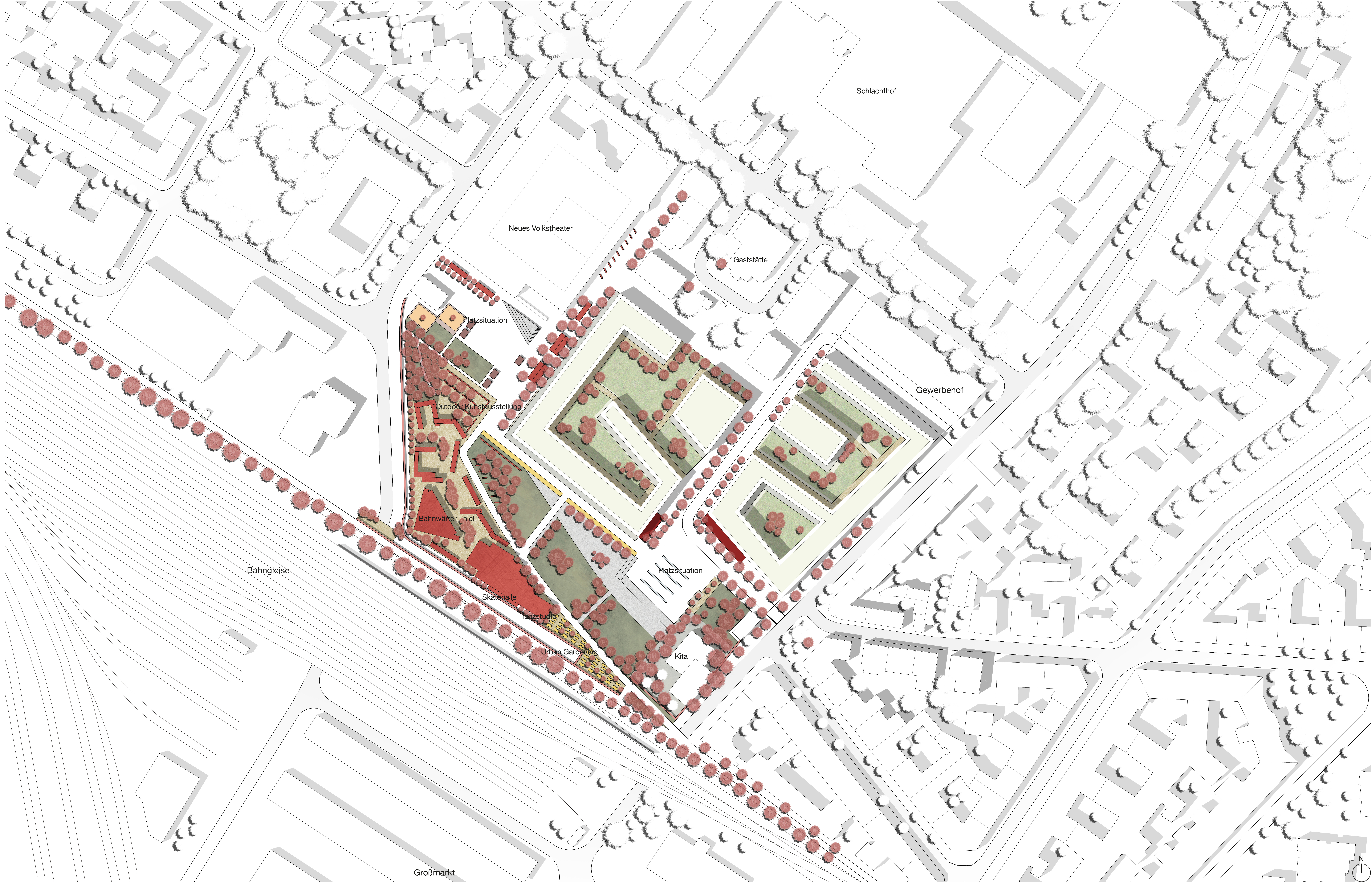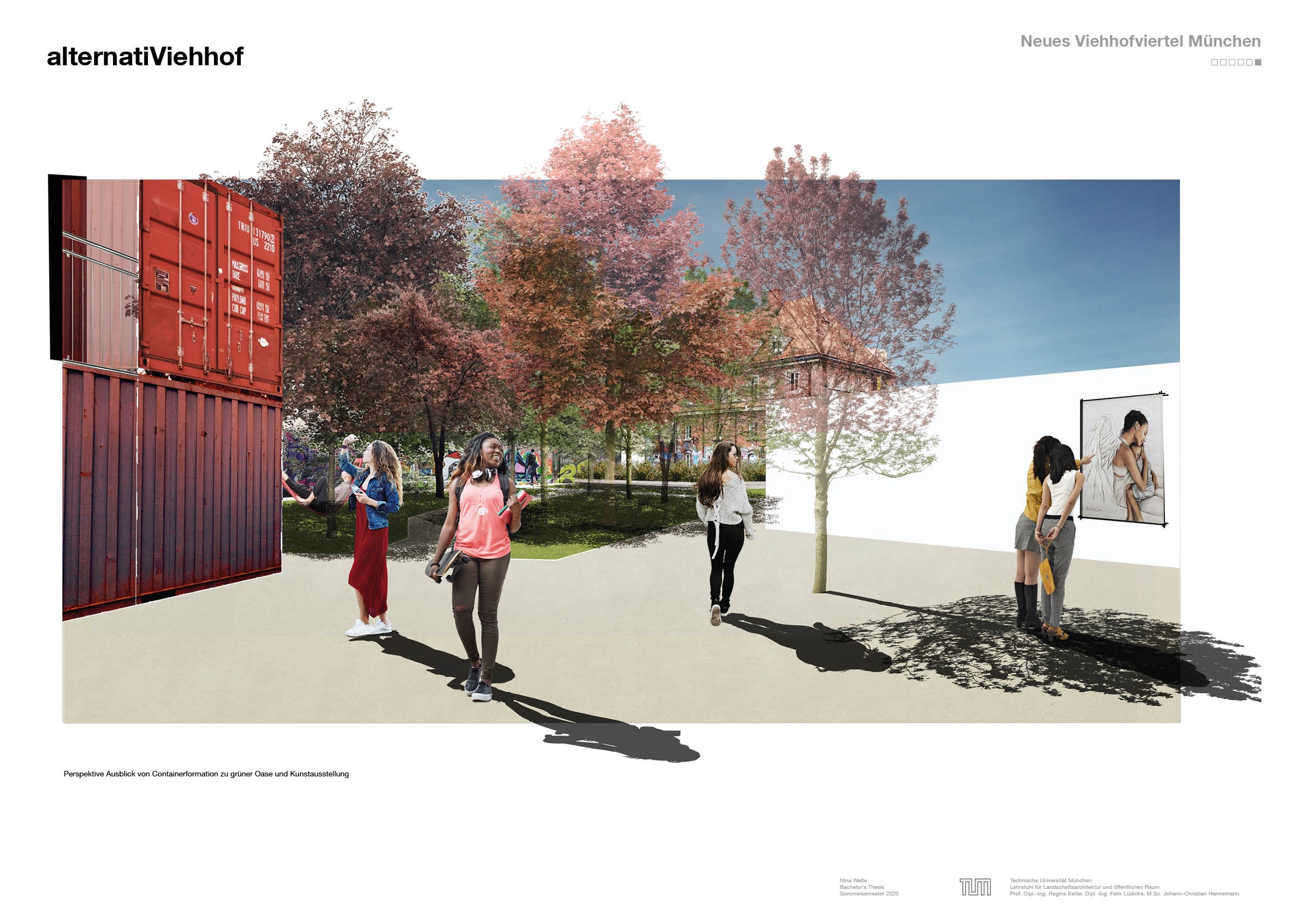 Der Entwurf besteht aus einer Abfolge von Räumen mit unterschiedlichen Eigenschaften, die sich zu einem funktionierenden Gefüge zusammenschließen. Im Vordergrund steht die historische Viehverladerampe, deren Struktur im Gegensatz zum Masterplan in diesem Entwurf integriert wird. Diese wird zu einer Wiese umgenutzt und nach Süden ausgerichtet. Der Höhenunterschied, der dadurch entsteht, wird durch ein angrenzendes Plateau mit Betonsitzstufen kompensiert. Als Absturzsicherung dient hier eine bepflanzte Pergola mit Fahrradstellplätzen. Die Mauern der Wagenwaschanlage werden in den Boden eingelassen und zu einem Wasserspiel, welches von den Außengastronomiebereichen der umliegenden Gebäude betrachtet werden kann. Außerdem werden Teile der Zwischennutzungen zu Dauernutzungen umfunktioniert, um die Atmosphäre des Areals zu erhalten. Um weitere Subkulturen anzulocken, wird im Süden des Viehhofareals neben den Südgärten eine Skatehalle mit Sonnenterrasse gebaut. Des weiteren soll das Quartier seinen kreativen Charakter nicht verlieren. Um diesen weiter zu stärken werden verschiedene dauerhaft vorkommende Einrichtungen im Sinne von Outdoor Kunstausstellungen und Containerausstellungen zu finden sein. Um dennoch den temporären Charakter der Zwischennutzungen weiterhin zu erhalten, wird das Ausgestellte sich häufig ändern können und somit als Aneignungsraum dienen können. Die grüne Oase oder die Blumenwiese können als Ruheort in dem sonst sehr aktiven Teil des Quartiers aufgesucht werden.