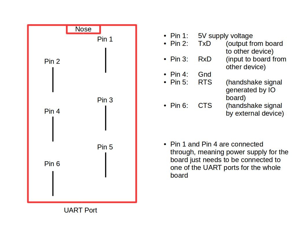 The board is powered by either connecting a power source to any of the UART ports (Gnd and Volt are connected through, see Fig. 3) or by using the USB Power supply port (Fig. 1, yellow).
