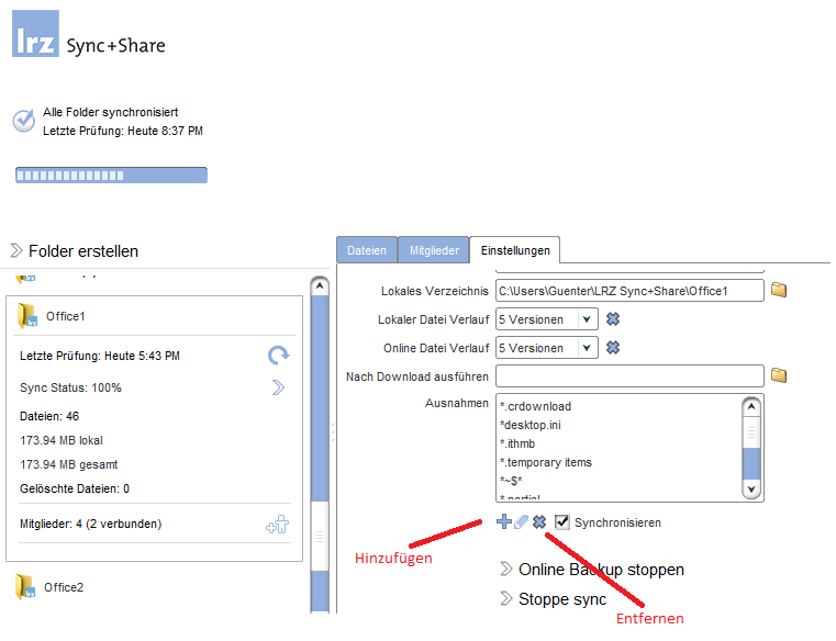 Diese Einstellungen wirken sich bei geteilten Top-Level-Ordnern auf alle Clients aus, die Zugriff auf den Ordner haben. Bei Rückfragen wenden Sie sich bitte an den LRZ Servicedesk.