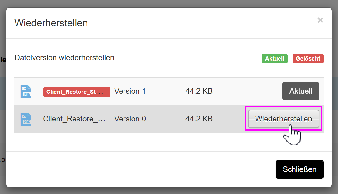 Nachfolgend ist Schritt-für-Schritt illustriert, wie sich Daten nach einer Löschung wiederherstellen lassen. Auf gleichem Wege ist es auch möglich ältere Dateiversionen bereitzustellen.