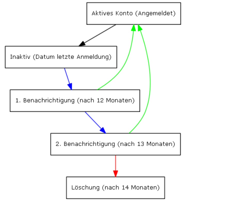 Bei Inaktivität wird ein LRZ Sync+Share-Konto gelöscht. Nach 12 und 13 Monaten wird an den inaktiven Nutzer eine Hinweis-E-Mail verschickt. Findet keine Anmeldung mehr bei LRZ Sync+Share statt, so erfolgt nach 14 Monaten, ausgehend vom Datum der letzten Anmeldung, die Löschung (Deprovisionierung) des Kontos.