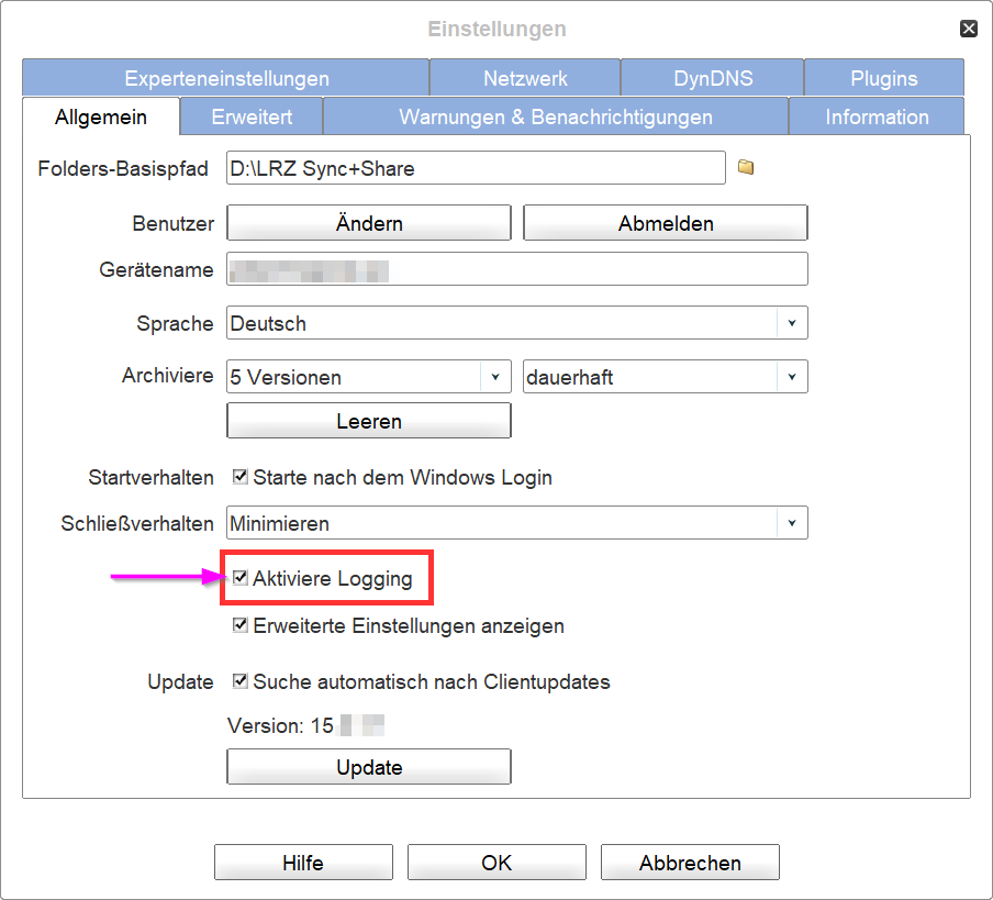 Um das Logging über die Einstellungen des Clients zu aktivieren bitte: