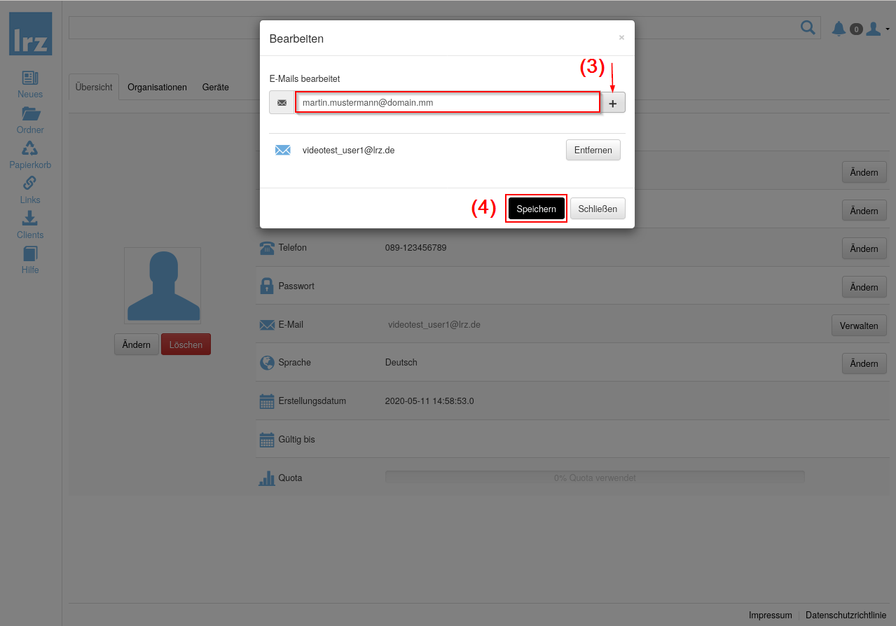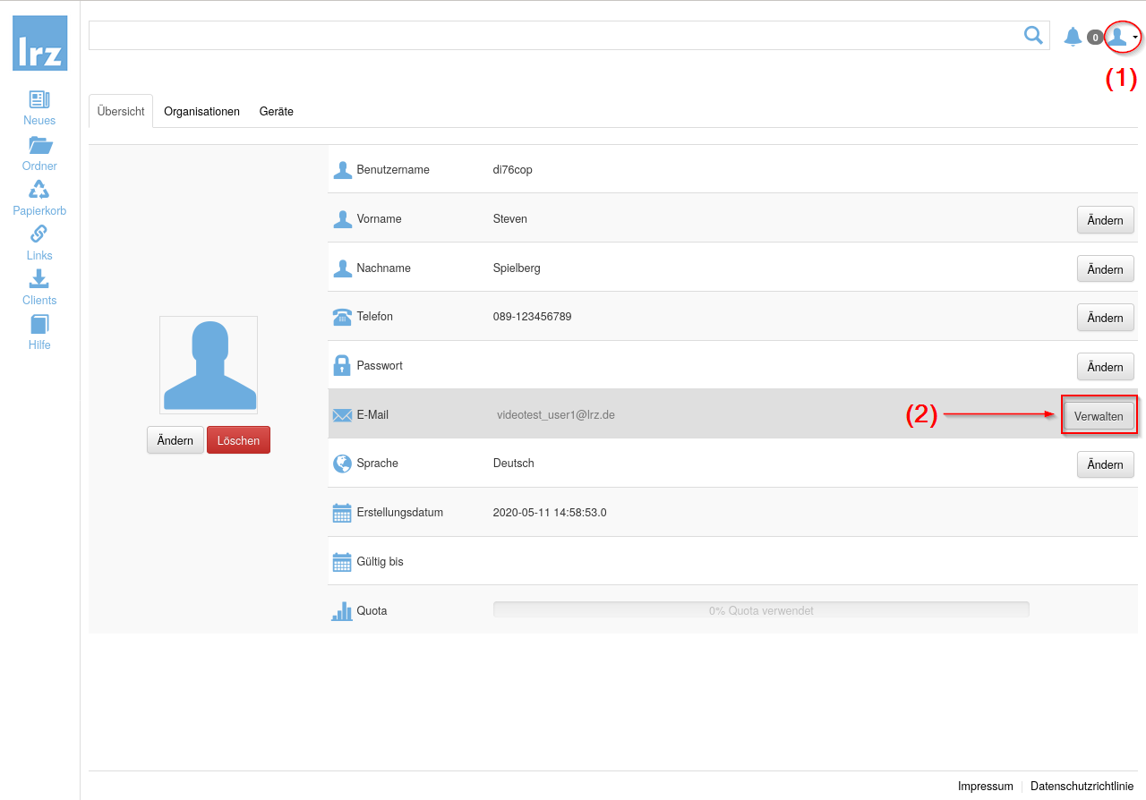 Eine E-Mail-Adresse lässt sich im Webinterface auf https://syncandshare.lrz.de wie folgt zu einem LRZ Sync+Share-Konto hinzufügen: