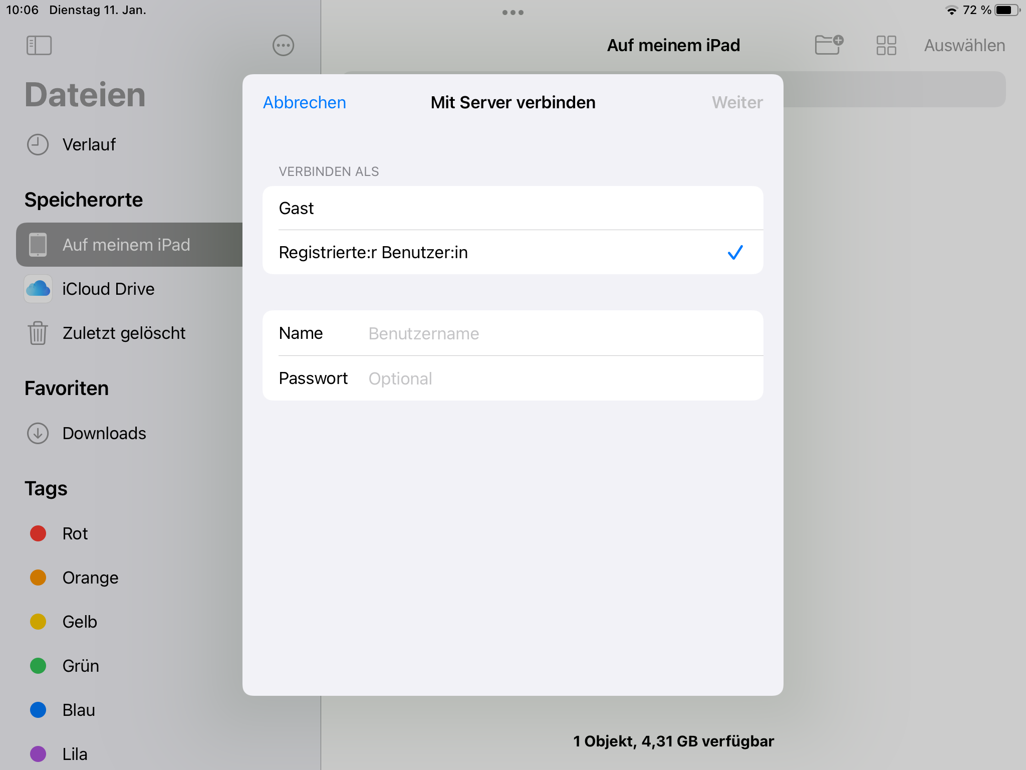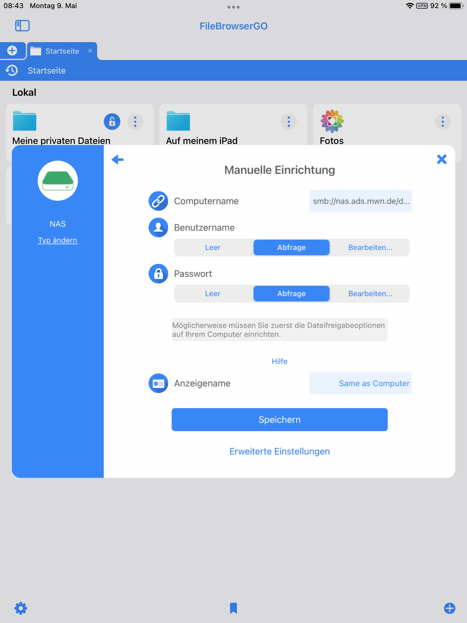 Bei iPadOS X kann mit der App „Dateien“ auf Dateien zugreifen, die auf Dateiservern liegen. Im nachfolgenden Dialog wird die Cloud Storage Adresse mit einem smb://-Präfix angegeben, also z. B. als smb://nas.ads.mwn.de/ne23mek. Schließlich müssen Benutzername (Kennung) und das Passwort eingegeben werden. Gehen Sie wie folgt vor: