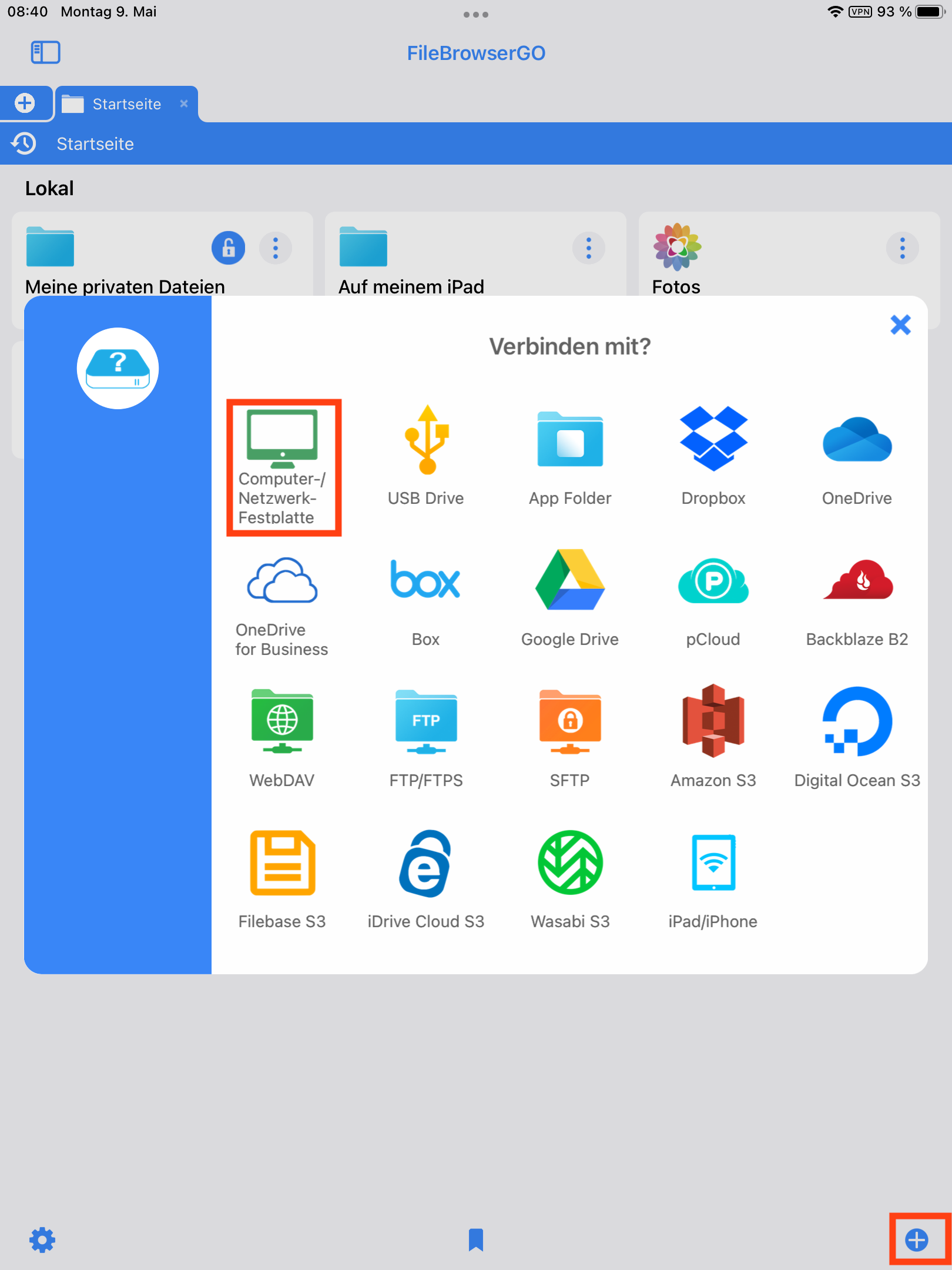 Schritt 1: In der App auf das Plus in der rechten unteren Ecke und dann auf "Computer-/Netzwerk-Festplatte":