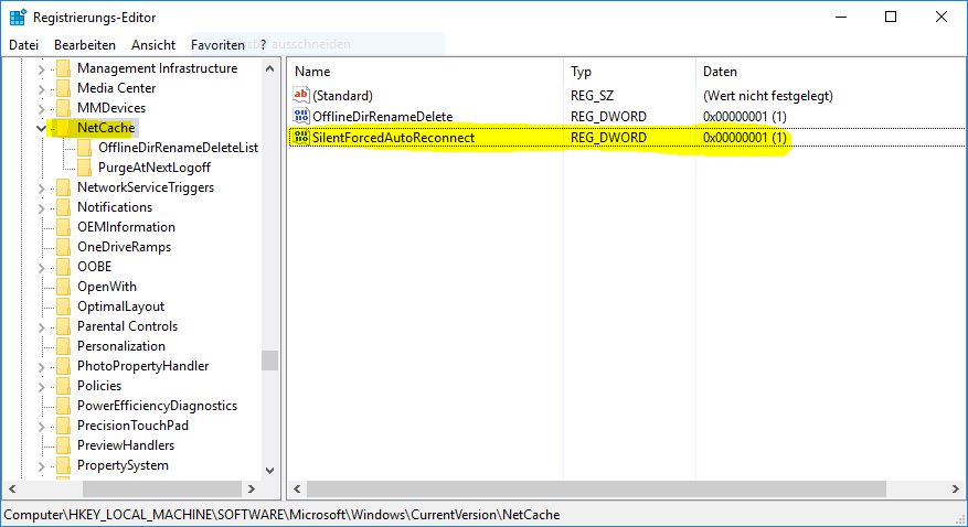 Es kann vorkommen, dass ein Client nach einem Wechsel zwischen verschiedenen Netzen nicht mehr automatisch online geht und Sie müssen manuell wieder online gehen. Sie können über einen Registry-Key dies verhindern und so den Client zwingen, immer Online zu gehen. Fügen Sie unter HKEY_LOCAL_MACHINE\Software\Microsoft\Windows\CurrentVersion\NetCache\