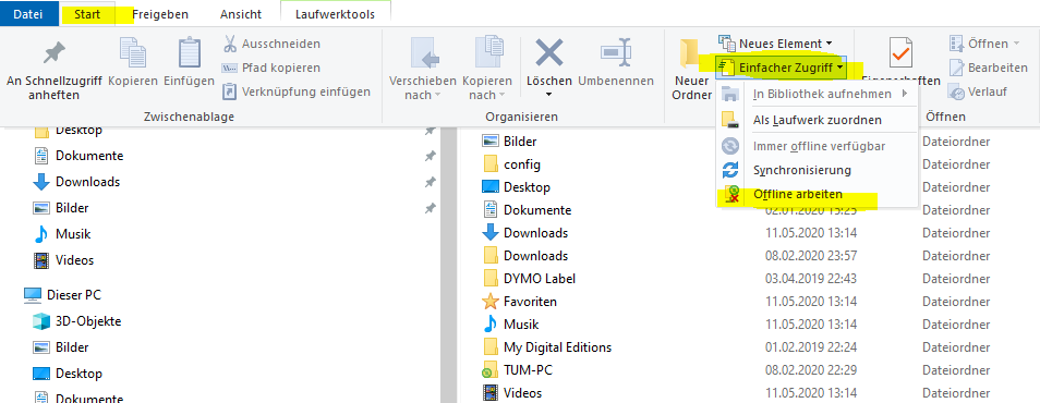 Wenn Ordner nicht angezeigt werden oder unter Windows 10 mit einem Kreuz bzw. unter Windows 11 mit einer kleinen braunen Aktenbox gekennzeichnet sind, dann sind die Ordner nicht offline verfügbar. Ordner mit einem grünen Kreis stehen offline zur Verfügung.