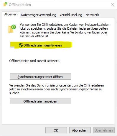 Die Offlinedateien sind ein Dienst auf dem Windows-Client. Wenn sich die Offlinedateien aufgrund von massiven Synchronisierungsproblemen nicht mehr online gehen, kann es helfen die Offlinedateien als Administrator einmal zu deaktivieren. Sie finden die Verwaltung der Offlinedateien in der Systemsteuerung im Synchronisierungscenter. Hier wählen Sie den Punkt "Offlinedateien deaktivieren". Danach müssen Sie den Client neu starten. Danach können Sie entweder offline weiterarbeiten, oder Sie aktivieren die Offlinedateien wieder. Müssen danach nochmal neu starten.
