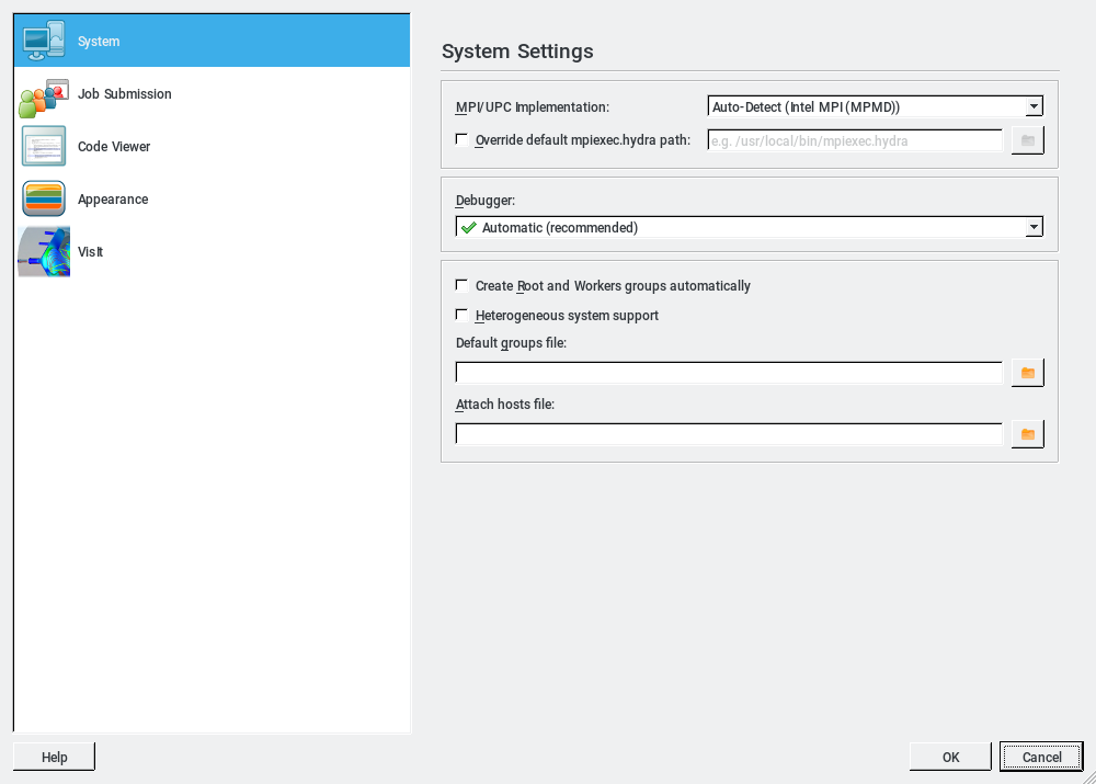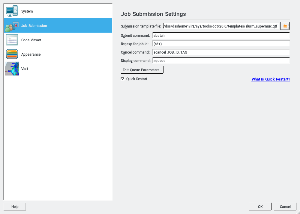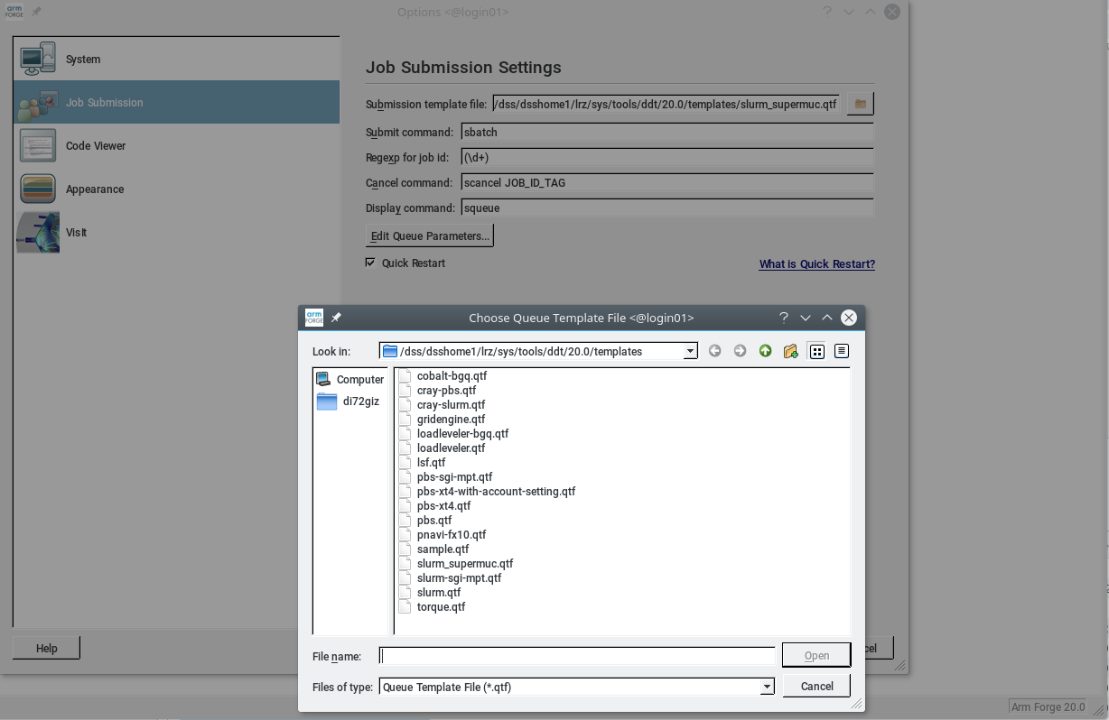 Select the slurm_supermuc.qtf file and the Job Submission Settings window should look like figure 6. Then click on the System icon and it should be populated as shown in figure 5. Now the initial configuration set up is done and only has to be redone if the ~/.allinea directory has been removed.