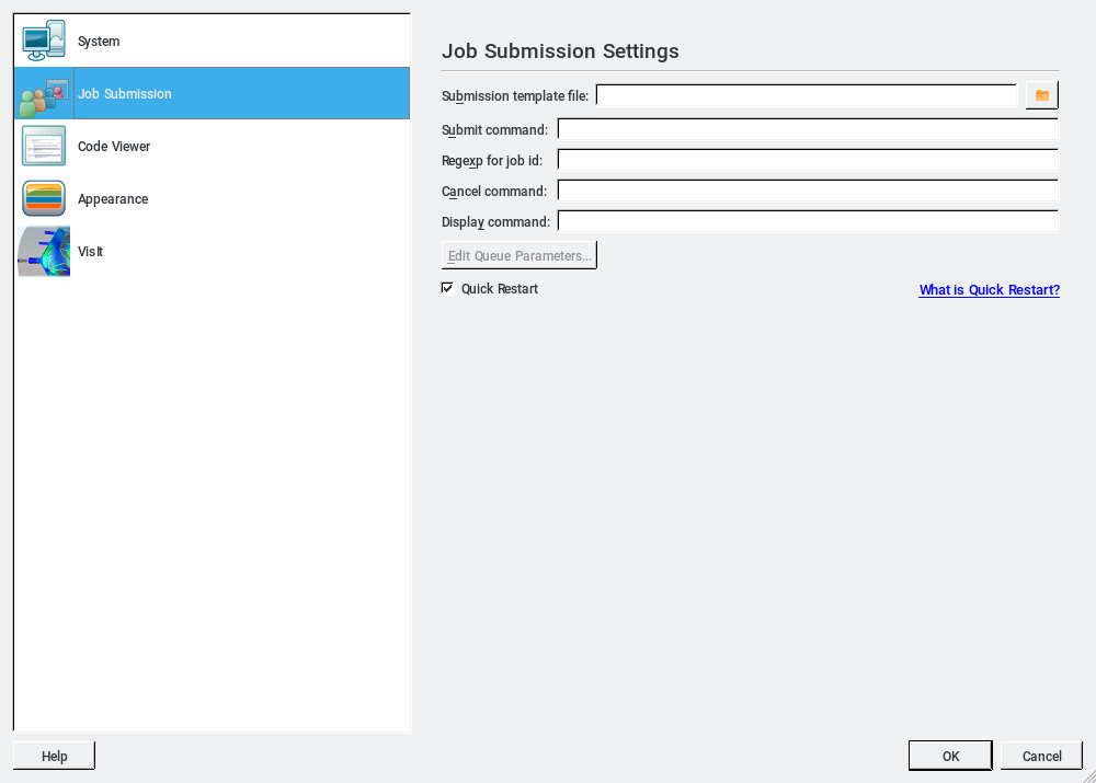 Next select the Job Submission icon and the Job Submission Settings window should be unpopulated as illustrated in figure 3. Now choose a Submission template file by clicking on the icon and the window in figure 4 appears.