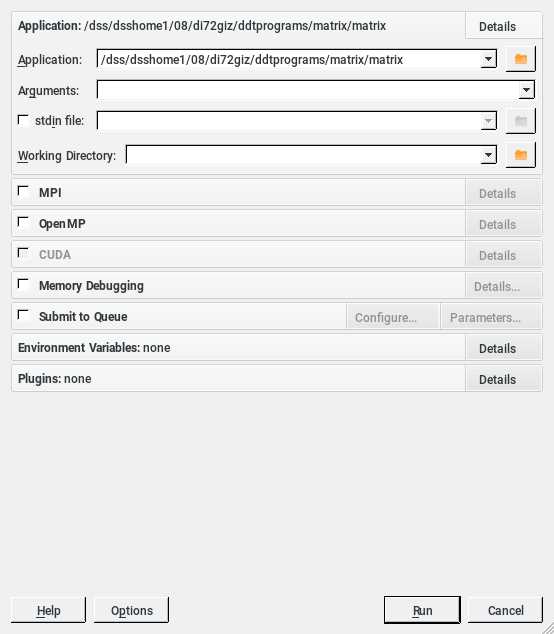 As shown in Figure 2 the executable and the corresponding parameters can be specified. Memory debugging and other features can be activated by selecting the tick box and configuration options can be accessed by clicking on the adjacent tabs.