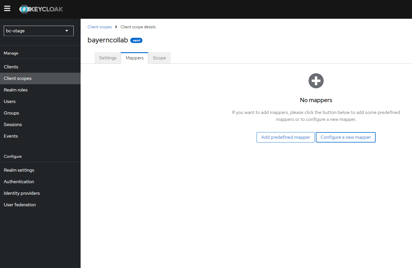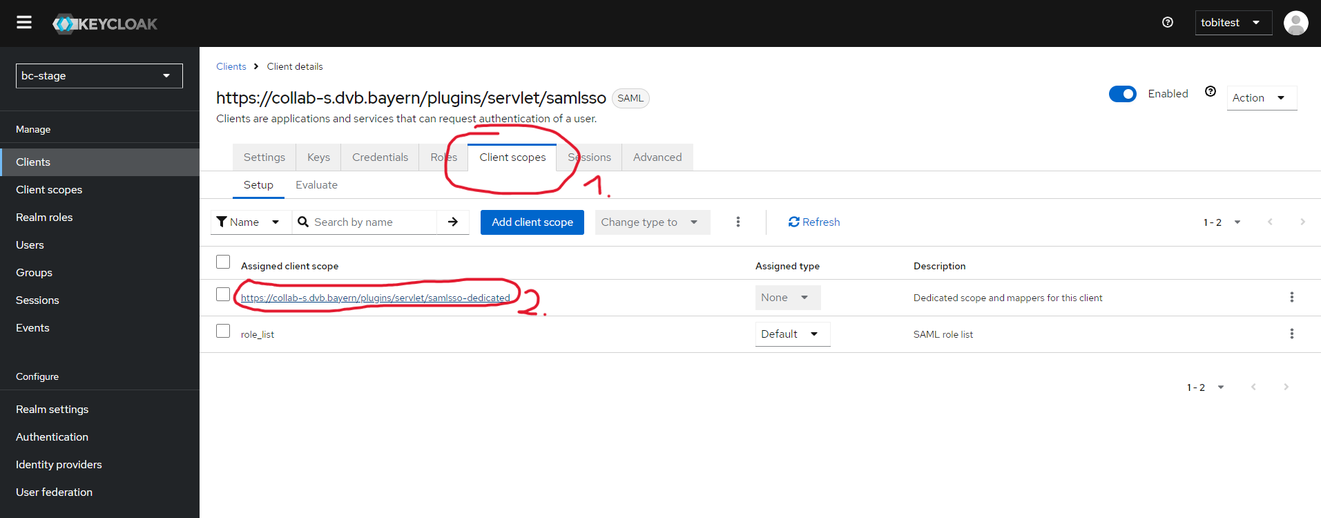 Dann auf die Client Scope klicken, die gleich benannt ist wie der Client selber.