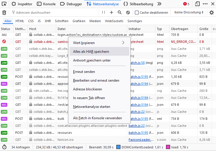 Eine HAR-Datei enthält die Netzwerkanforderungen, die im Rahmen der Übermittlung in dem jeweiligen Browser-Tab durchgeführt werden sowie deren Rückmeldungen.