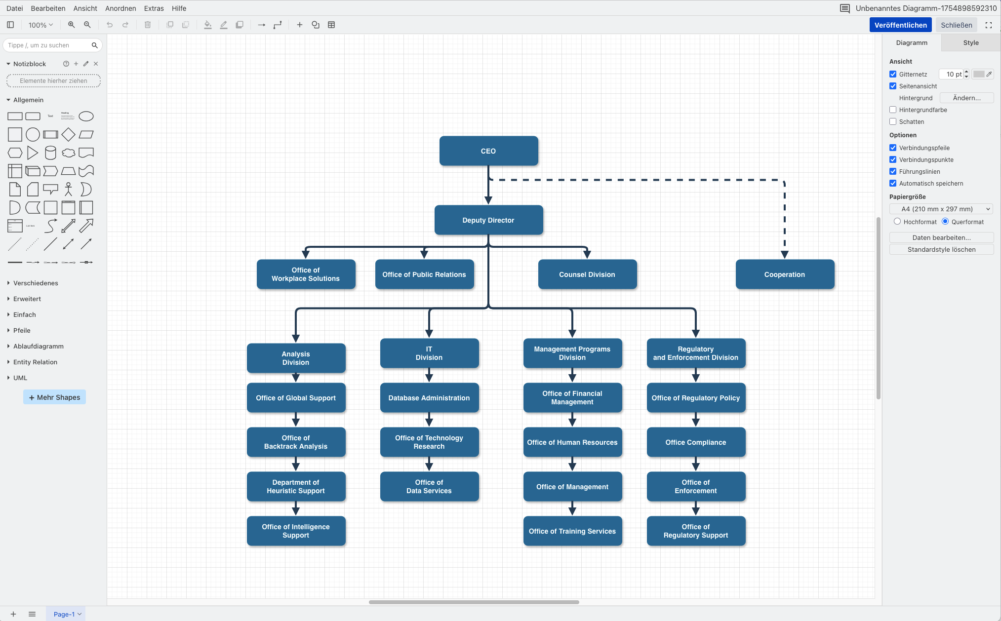 In diesem Editor können mehrere Leute gleichzeitig an einem Diagramm arbeiten. Links haben wir eine Vielzahl an Formen zur Auswahl. Um ein Diagramm zu speichern, muss man oben rechts auf den "Veröffentlichen" Knopf klicken. Diagramme können ebenfalls über Datei → Exportieren als Bilder, PDFs oder Vektorgrafiken exportiert werden.