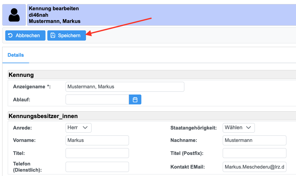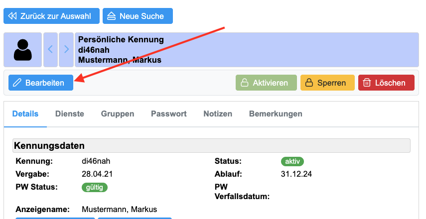 3. Wenn Sie Änderungen an Kennungen, Gruppen oder Verteilern vornehmen wollen, müssen Sie den blauen "Bearbeiten"-Button im oberen Bereich anklicken. Vergessen Sie nicht, nach erfolgter Änderung auf "Speichern" zu klicken. 4. Bei manchen einzelnen Feldern finden Sie ein Stift-Symbol. Damit können Sie das daneben stehende Feld (und nur dieses) |