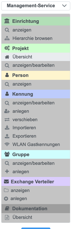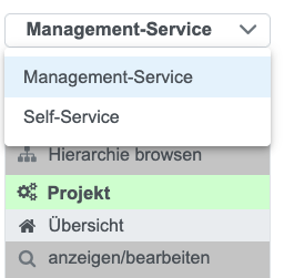 1. Um Projekte und Kennungen verwalten zu können, müssen Sie links oben auf "Management Service" stellen. Der "Management Service ersetzt die bisherigen "Master-User-Dienste". | |