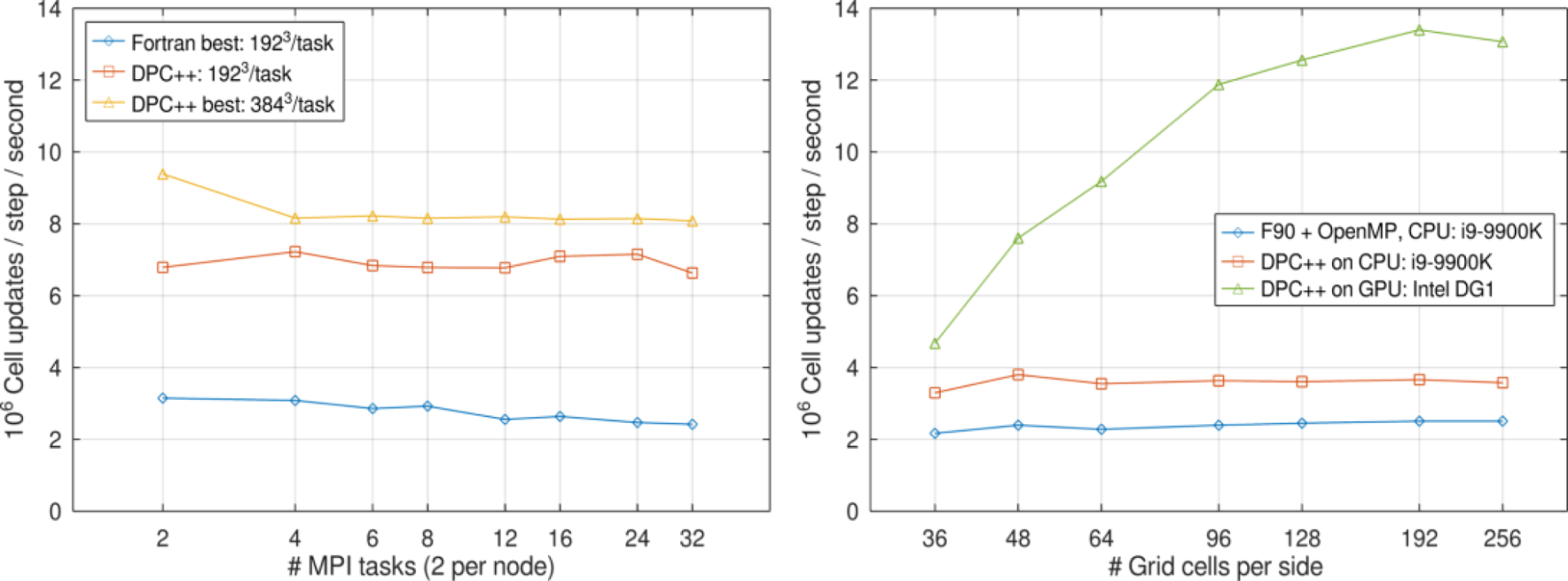 We present a scaling comparison of DPEcho versus the baseline ECHO, running the same problem setup. We first conduct a weak scaling test on the Intel Xeon 8174 nodes of SuperMUC-NG at the Leibniz-Rechenzentrum (left). We observe essentially flawless scaling up to 16 nodes, and performance up to 4x higher than the baseline version. The reduced memory footprint of DPEcho allowed the placement of 3843 cells per MPI task, instead of 1923. The inclusion of the Intel® Iris® Xe MAX Graphics (right) increases performance up to 7x, surpassing even non-accelerated HPC hardware. This is a testament to the superior portability and efficiency of SYCL code, making the most efficient use of all classes of hardware.