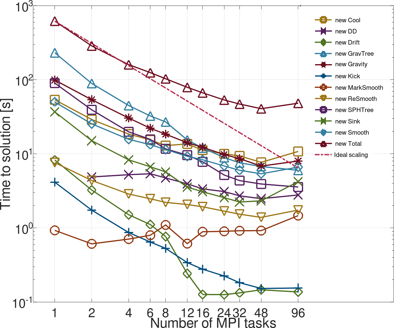 The speedups of all kernels involved in the optimization are shown in the left figure. The Gravity and GravTree components present the most significant speedups (∼20% and >80%, respectively), leading to an overall ~25% improvement. The right figureshows a single-node scaling test with the g2.19e11 test case (halo mass ∼2 × 1011 M⊙ at redshift 0), featuring the time to solution of individual kernels. While the scaling, on this test case, deviates still early from the ideal (likely due to load imbalance), the optimized performance is still > 25% better than the initial. The figure is also a guide for for finding bottlenecks in view of future optimization projects. Due to its improved scaling, GravTree is no more the top-pressure bottleneck.