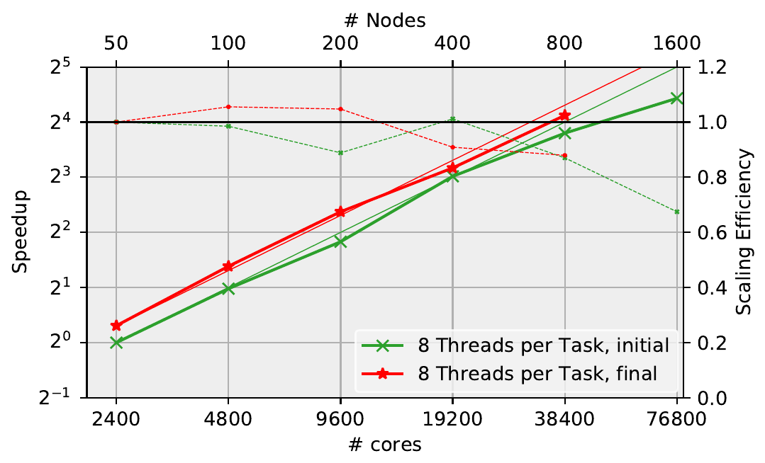 Thus we were able to achieve a scaling close to ideal up to about 50 k cores during the LRZ Extreme Scaling Workshop. The performance degrades significanlty around 70 k cores, however succesful runs with stil satisfactory perfomance were now possible up to about 150 k cores. The reason for this loss is not yet completely understood, but it is likely associated with a different load-balancing at intermediate core counts for the specific problem setup, and will be ivestigated in the future. Both parties were very satisfied with the achieved optimization and look forward to further collaborations.