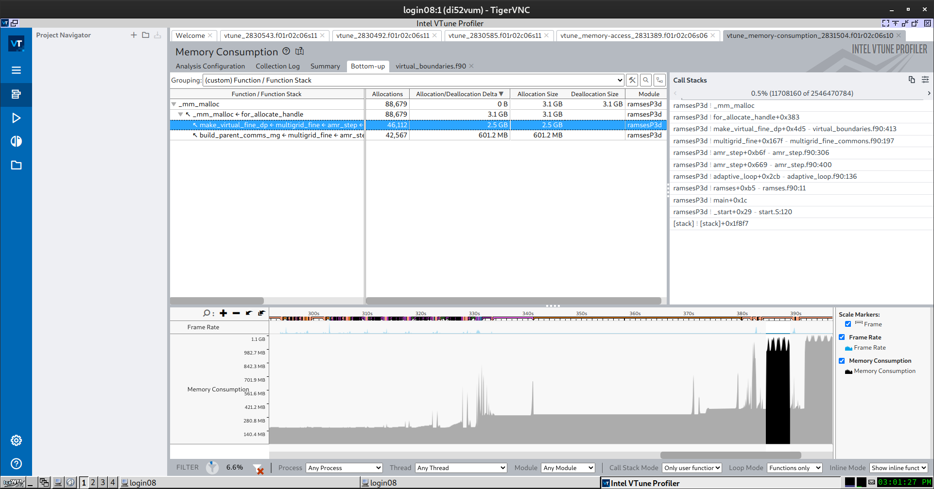 Early tests revealed a rather high degree of vectorization, though with some room for improvement as the code contains a mix of compute-bound and memory-bound (the slight majority) kernels. VTune’s threading analysis exposed an OpenMP imbalance, addressed by adding dynamic scheduling to the loops with significant workload. This yielded an average performance improvement of ∼ 5%. Yet the same analysis identified the main bottleneck as large serial code blocks in the ghost-cell exchange. Restructuring of the code allowed to fully OpenMP-parallelize this section of the code, which led to an average performance increase of 27% compared to the initial code.