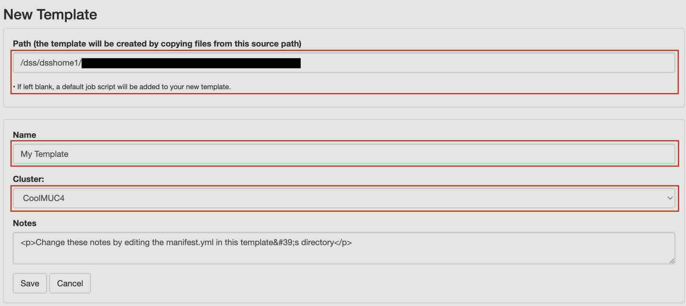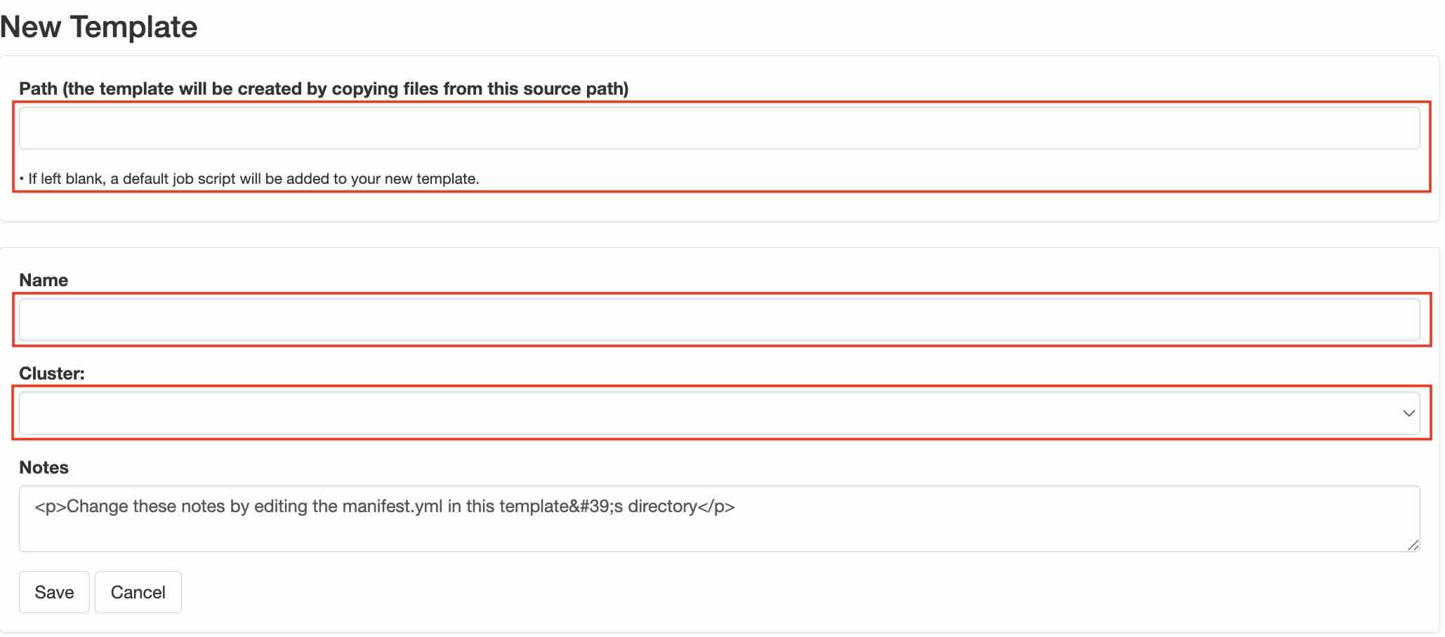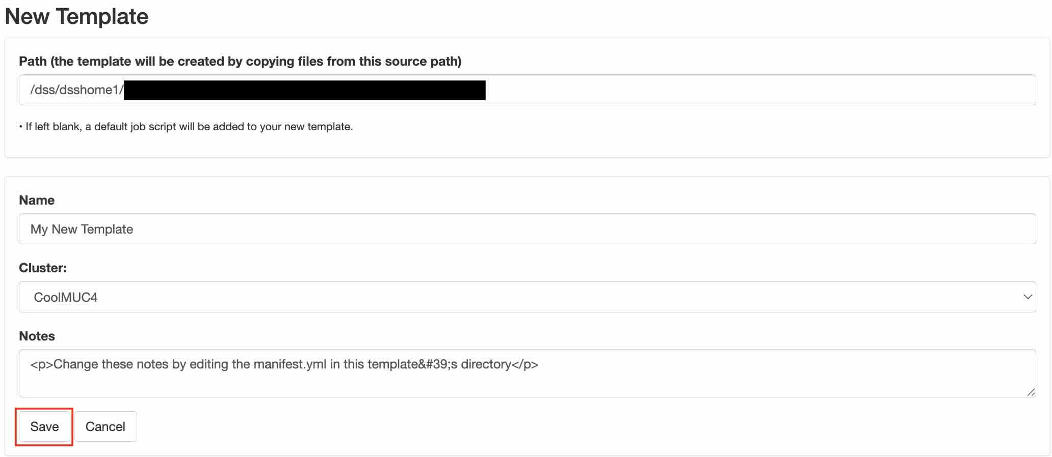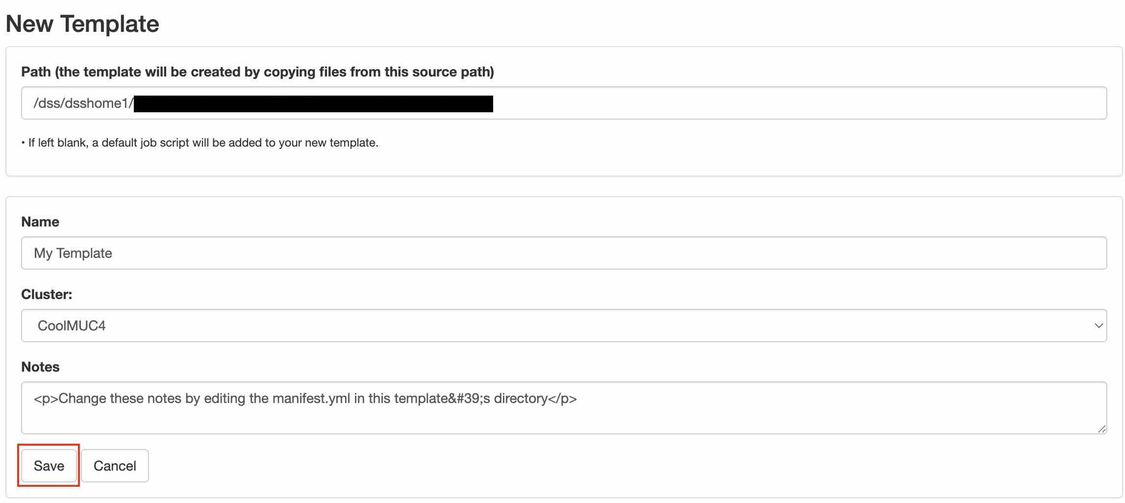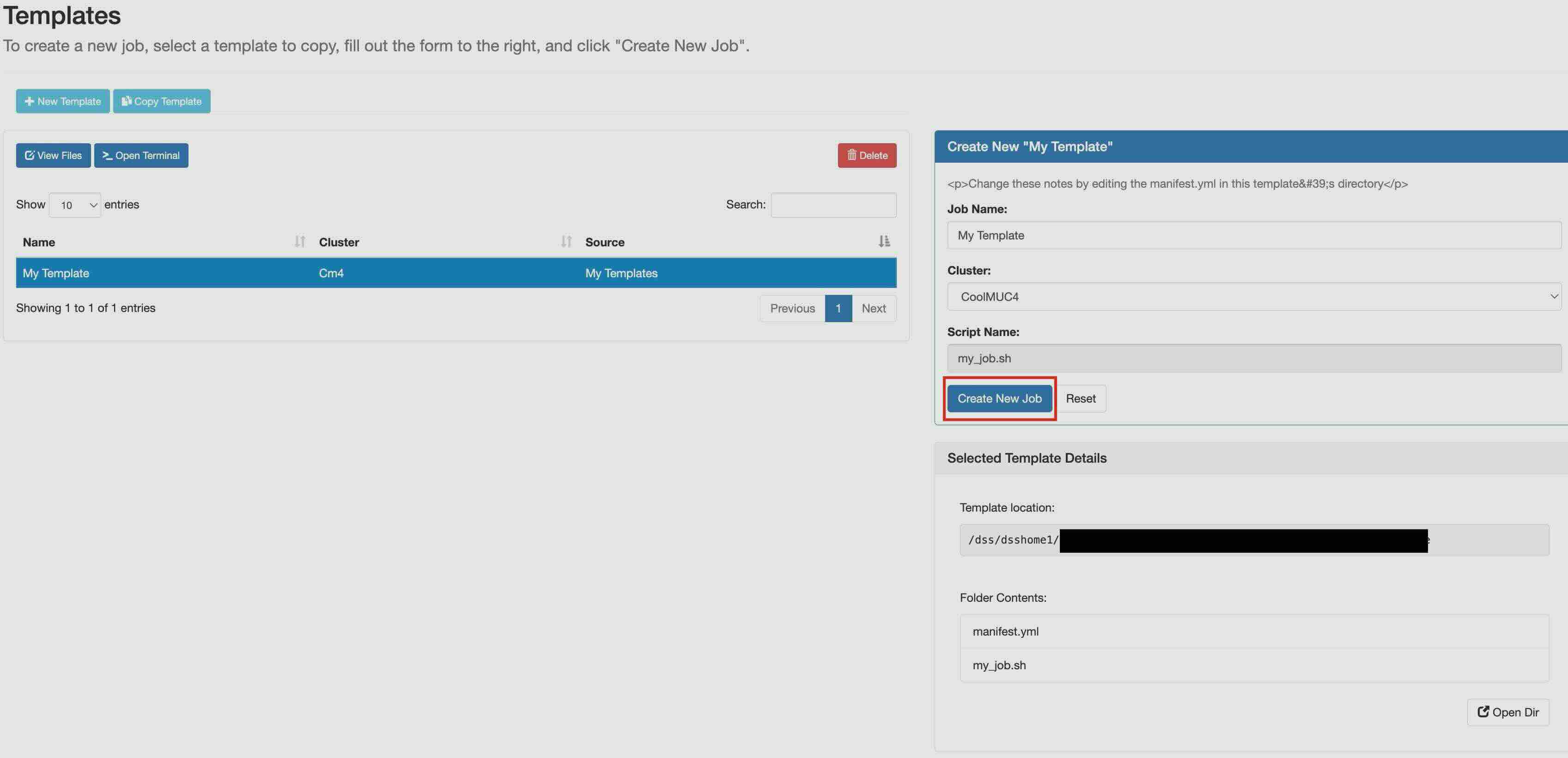 To create a new template from an arbitrary path in your HOME directory containing at least a job script (though it may include additional data), navigate to the Templates section.