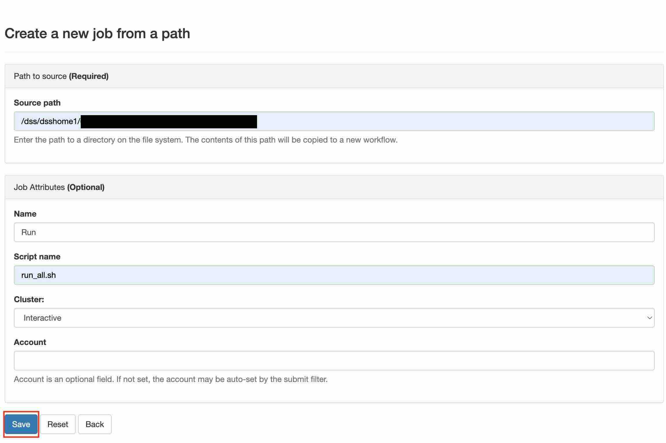 After selecting this option, a details page will be displayed. In the details page, enter the job file path in the Source Path section, provide a descriptive name in the Name field, ensure the Script Name matches the batch file name, select the appropriate cluster in the Cluster section, and enter your account name in the Account section.