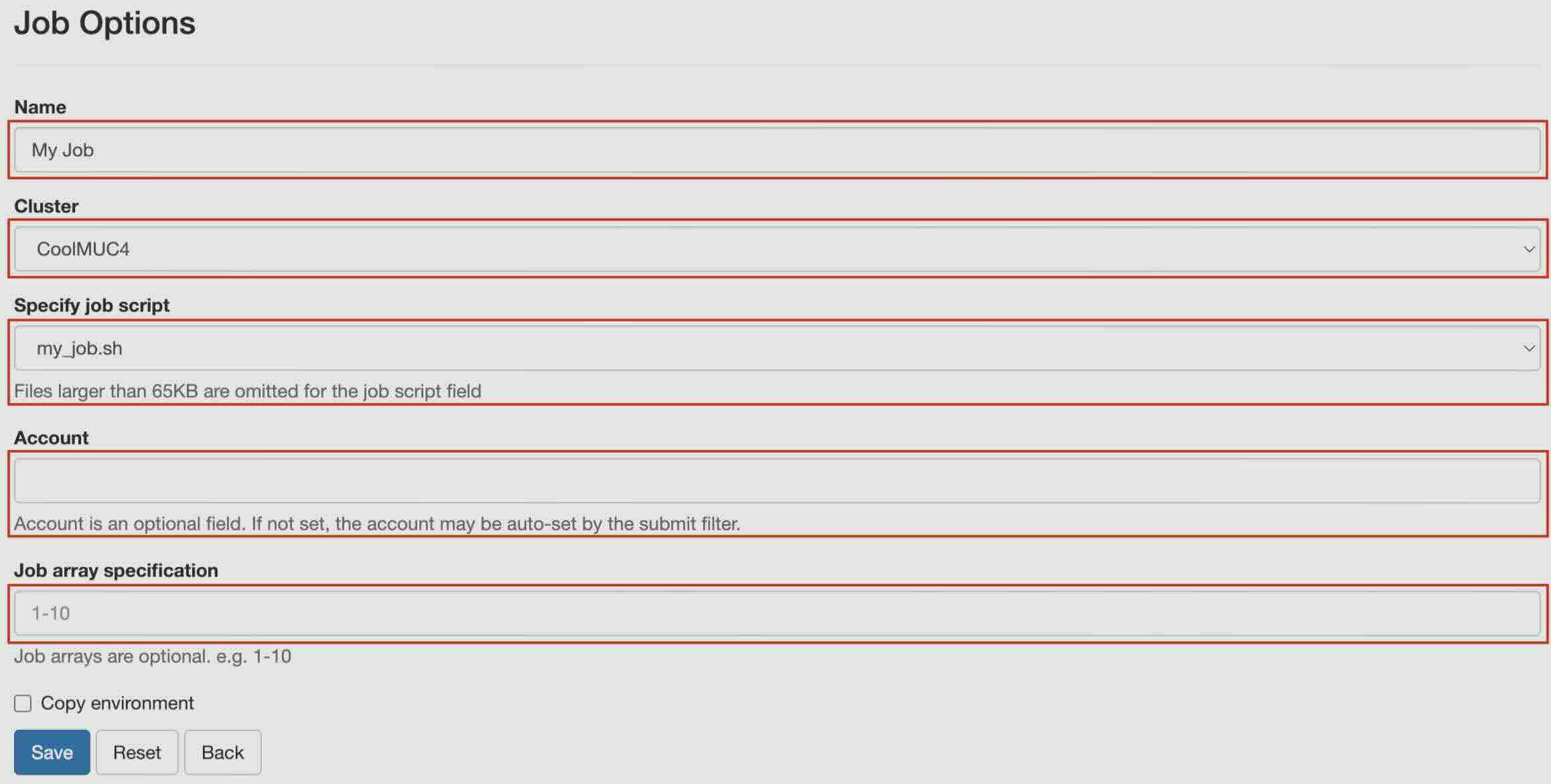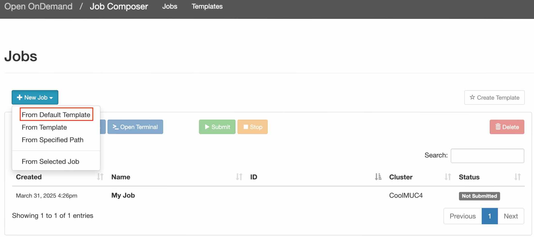 To create a batch job from the default template, select From Default Template. This is useful if you want to quickly set up a job with standard configurations. This will create a sample job script named main_job.sh.