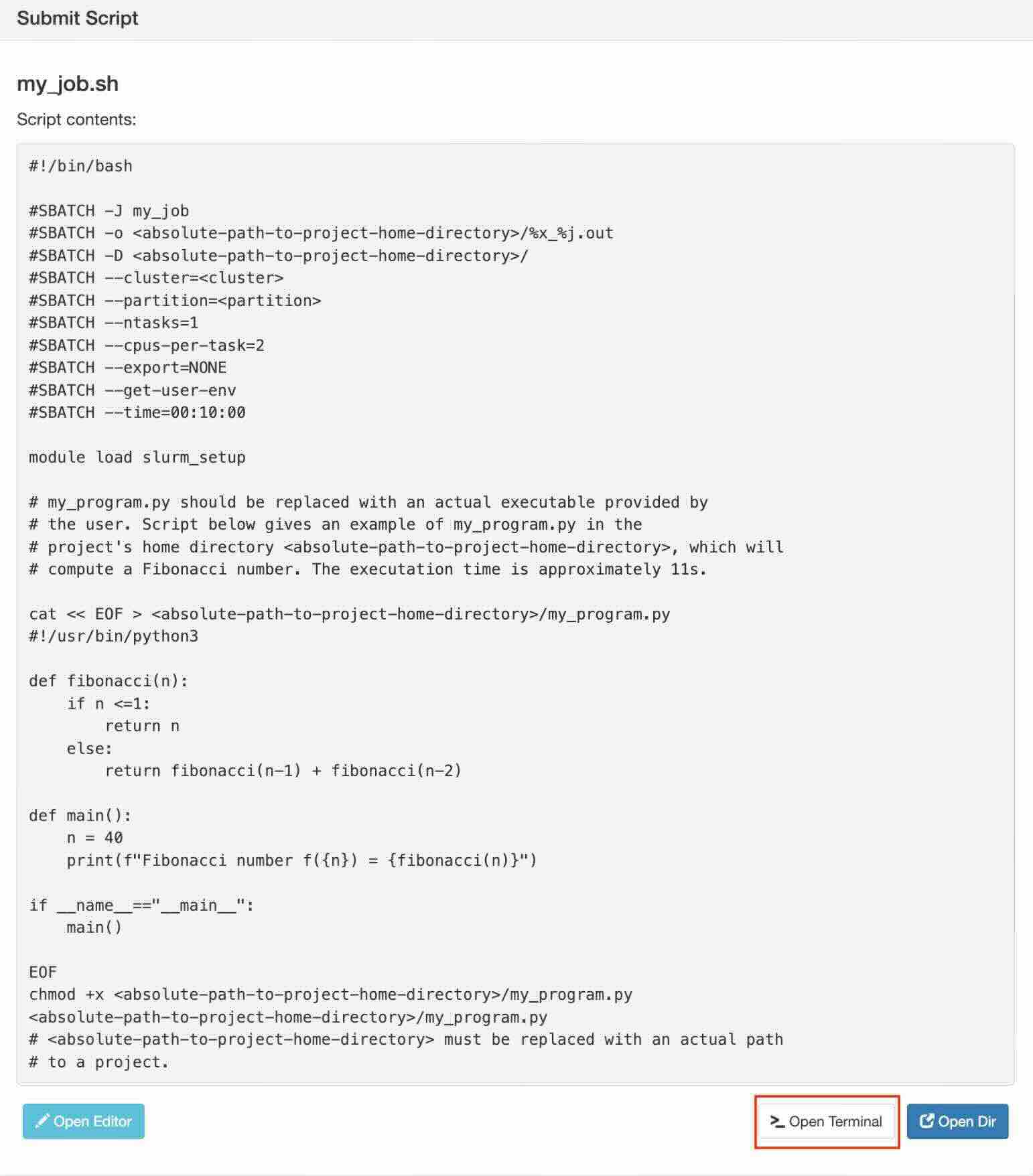 You can open a new terminal at the job path with CoolWP: Shell Access by clicking the Open Terminal icon in the upper left corner or at the bottom of the Submit Script section.