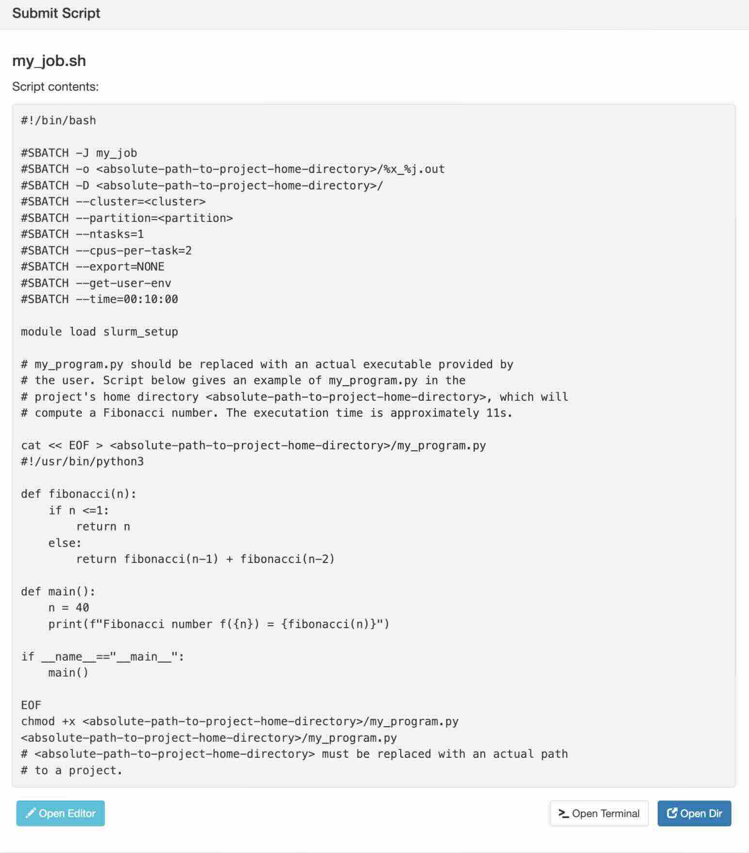 The Submit Script section displays the contents of my_job.sh, which specifies the job configuration, resource allocation, and execution commands required for submission.