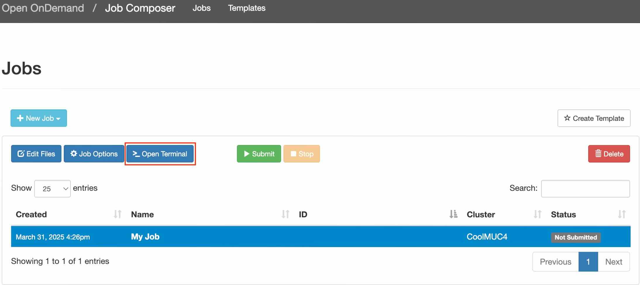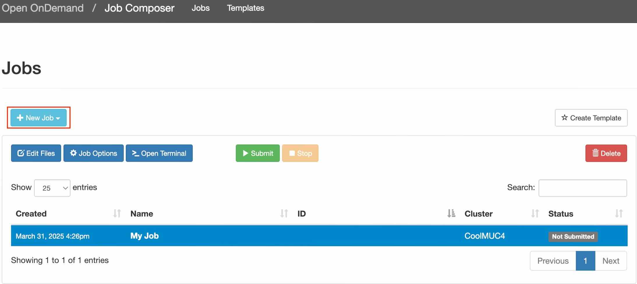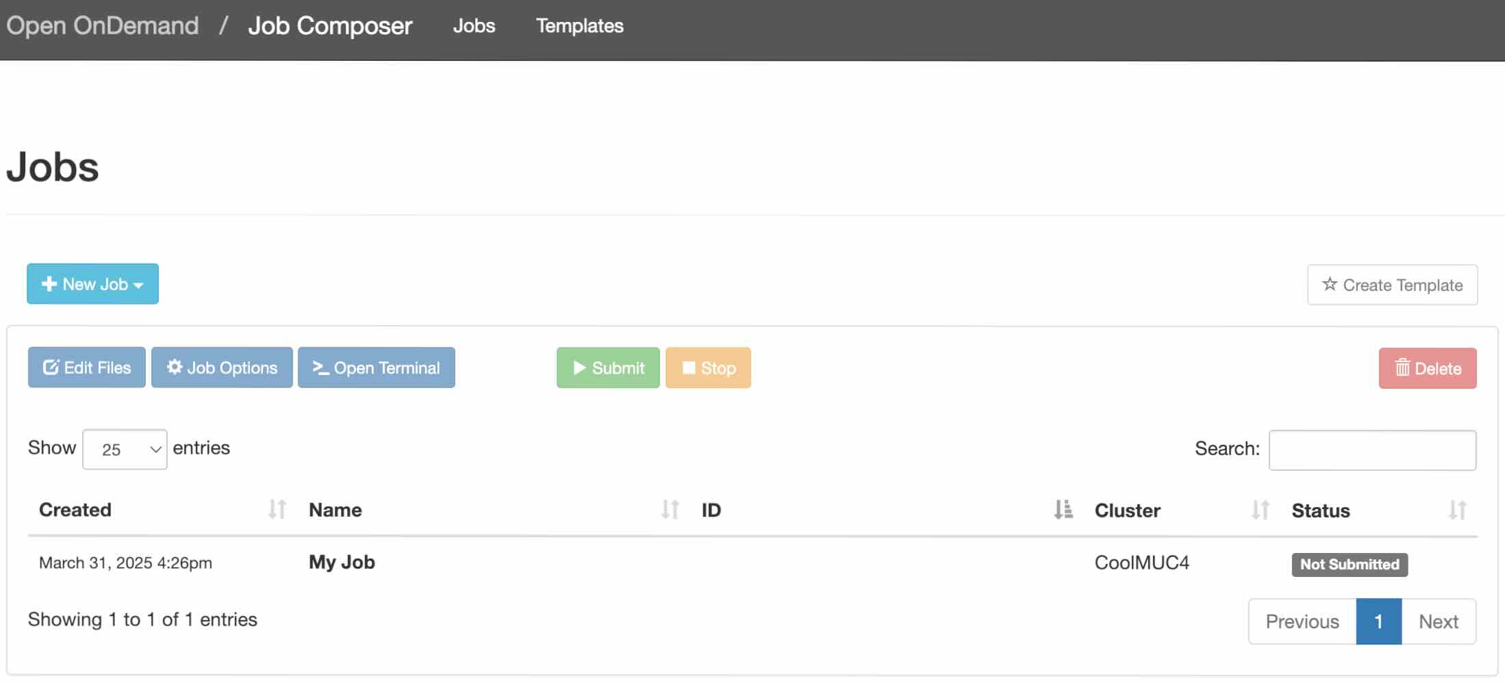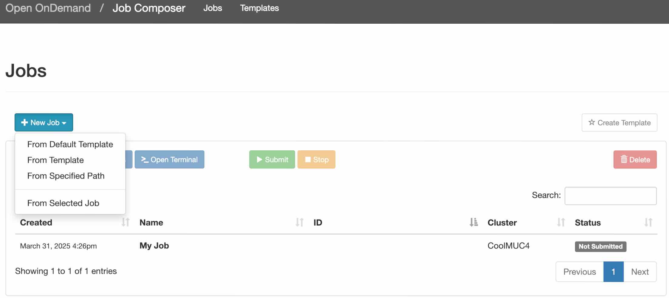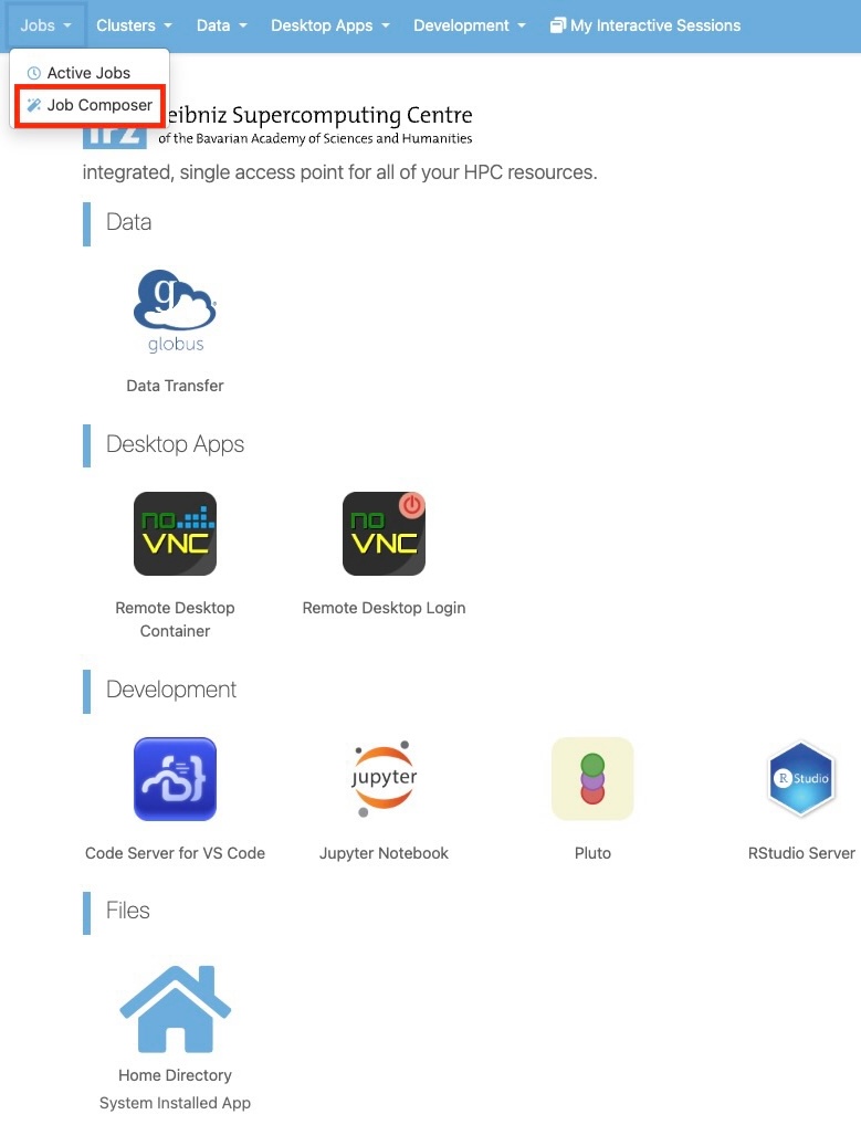 The Job Composer is a web-based tool designed for efficiently creating and managing batch jobs using predefined template directories. It is designed to replicate a straightforward yet commonly used workflow for typical HPC center users. It can be opened by selecting Job Composer from the drop-down list under Clusters in the upper menu bar.