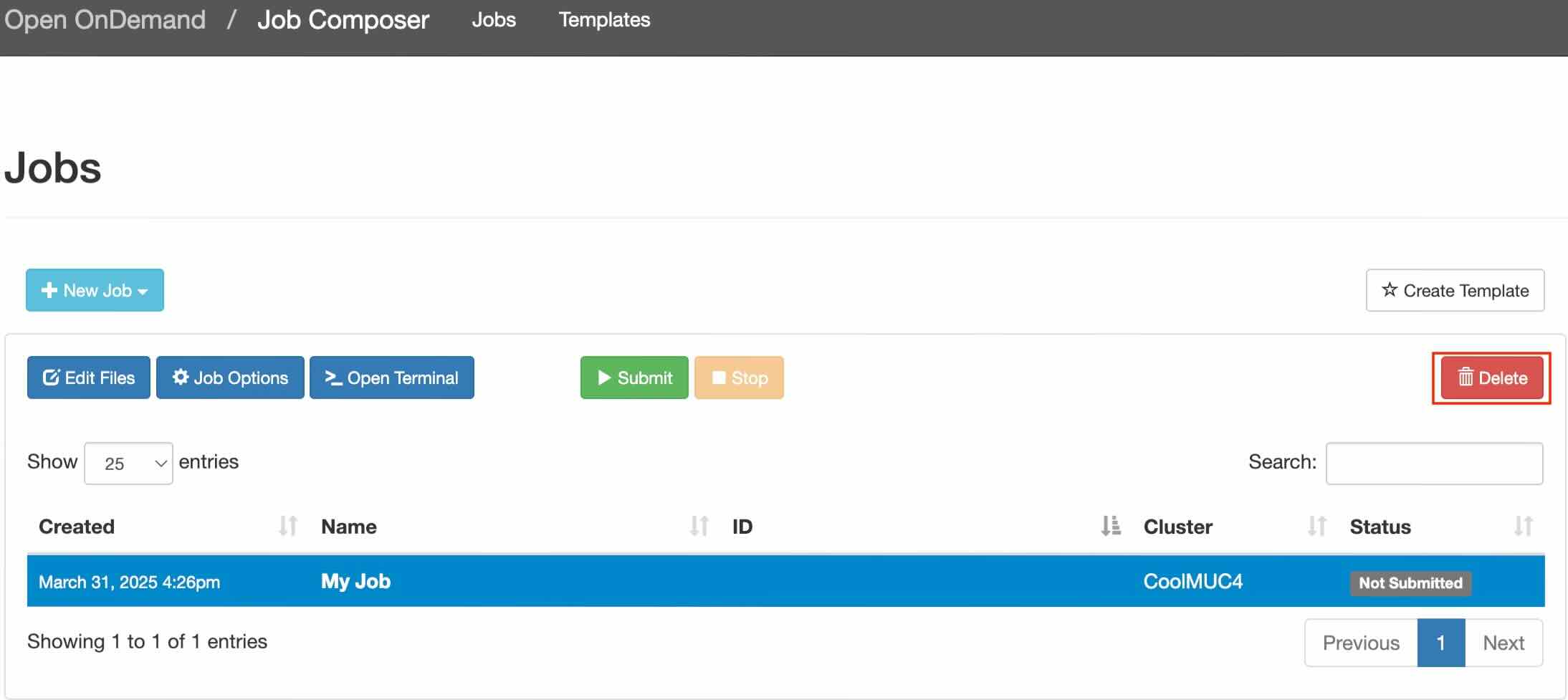 Jobs can be deleted by selecting an existing job and clicking the Delete icon to remove it from the list.