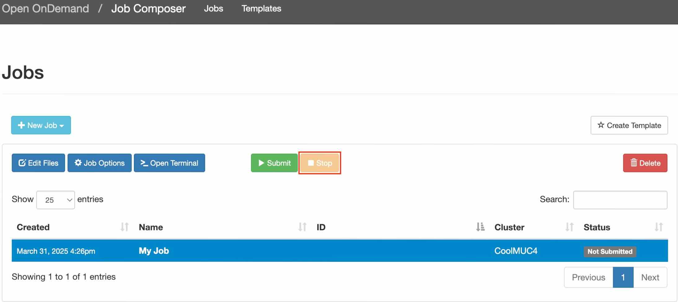 Jobs can be stopped by selecting a running or queued job and clicking the Stop icon.