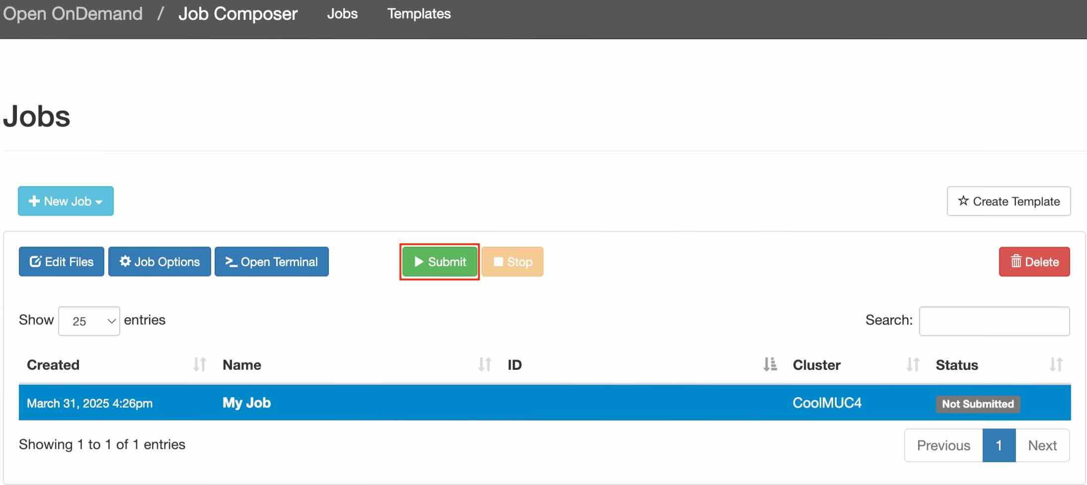 Jobs can be submitted to the batch queue by selecting an existing job and clicking the Submit icon.