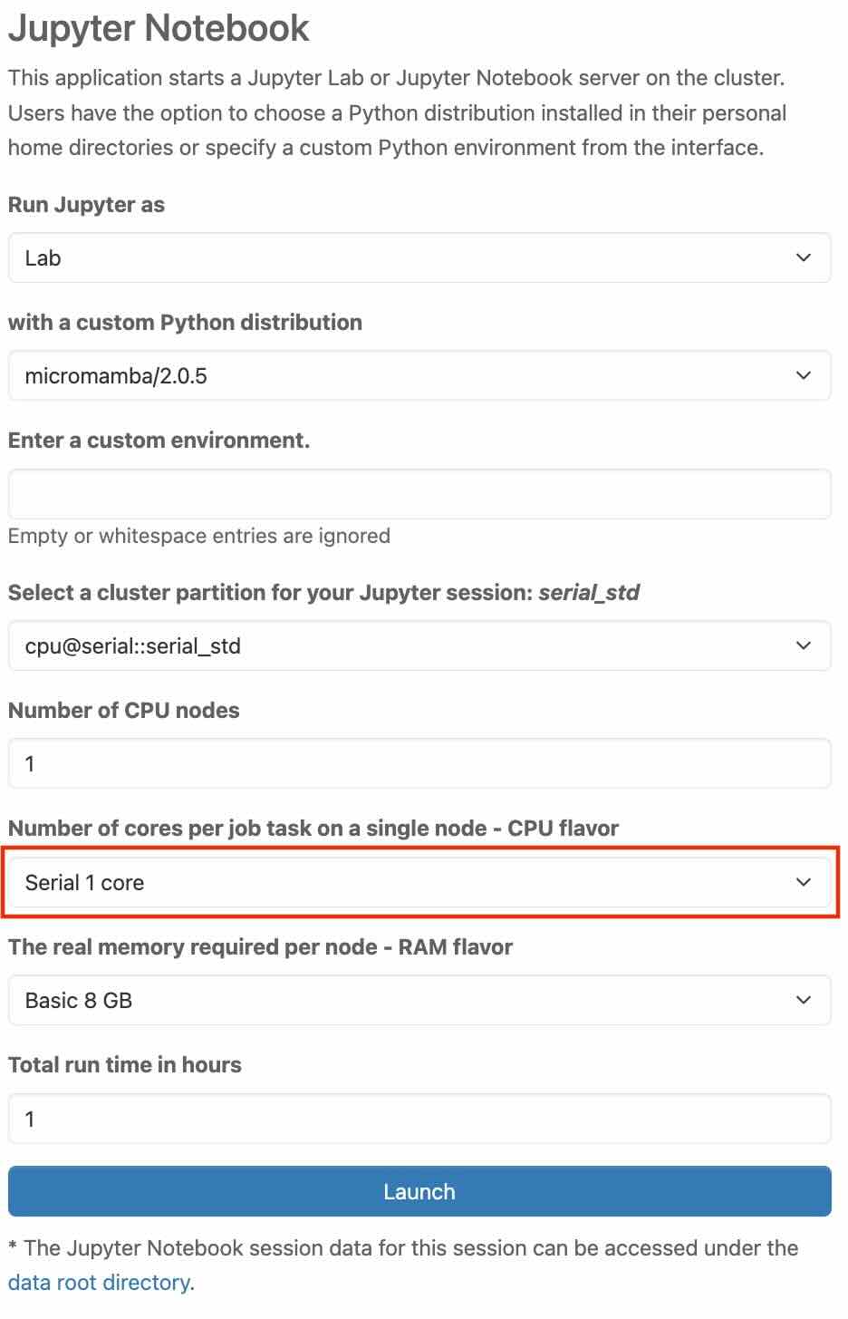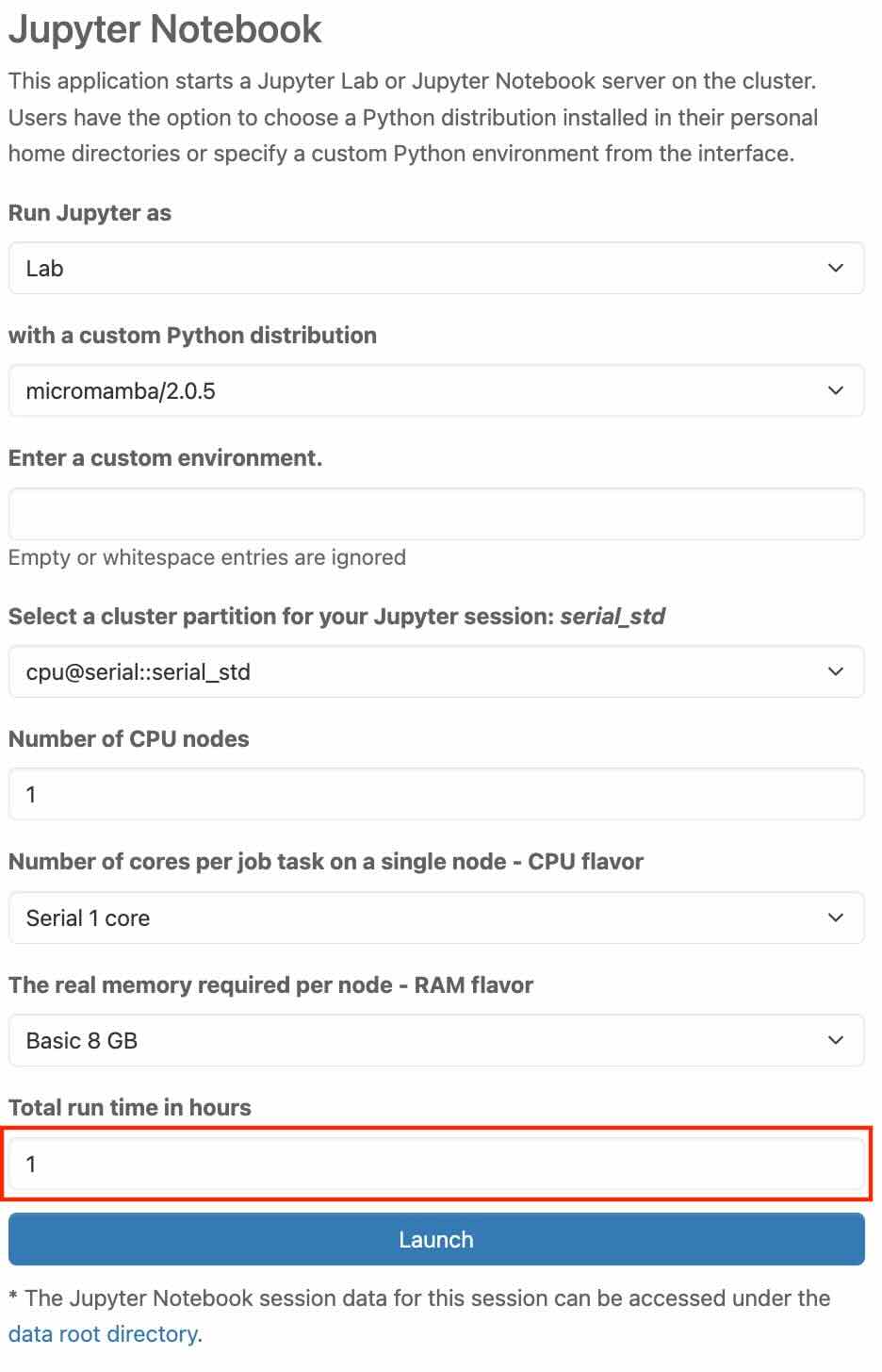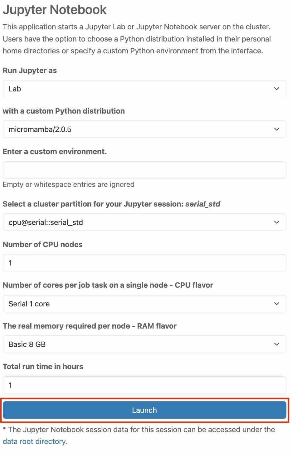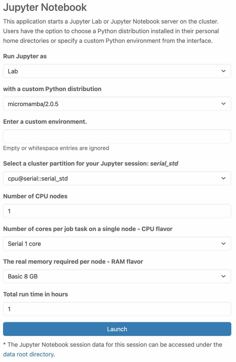 After clicking Jupyter Notebook from the panel, you will find yourself on an overview page providing important information about the resources you want to use. Before you can launch Jupyter Notebook, you must provide some information about the resources you want to use.