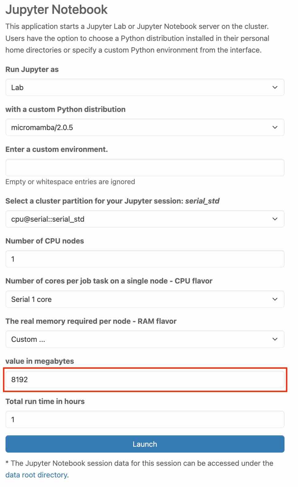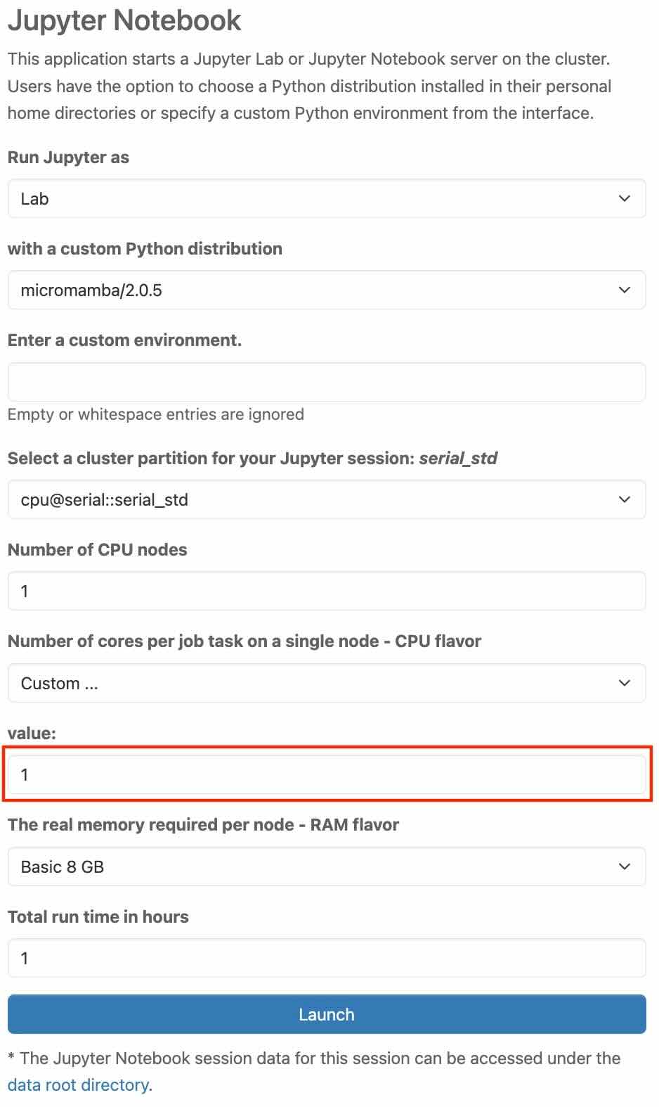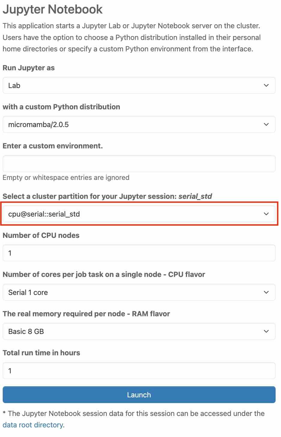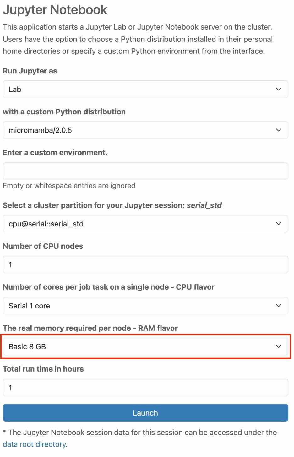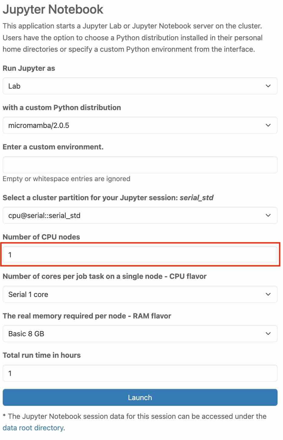 After clicking Jupyter Notebook from the panel, you will find yourself on an overview page providing important information about the resources you want to use. Before you can launch Jupyter Notebook, you must provide some information about the resources you want to use.