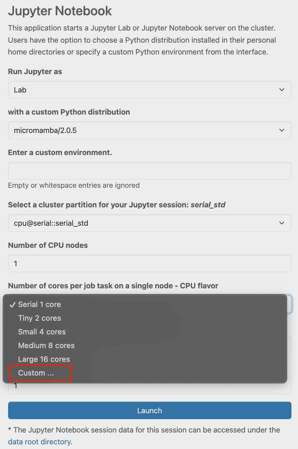 In this section, you choose from a list of predefined resource profiles. Each profile defines the number of cores per job task. It tells you how many CPU cores each task of your job will use on one node in the cluster, and what type of CPU (flavor) you want to use. If you need a different number of cores per job task, you have the option to do that as well with "Custom".