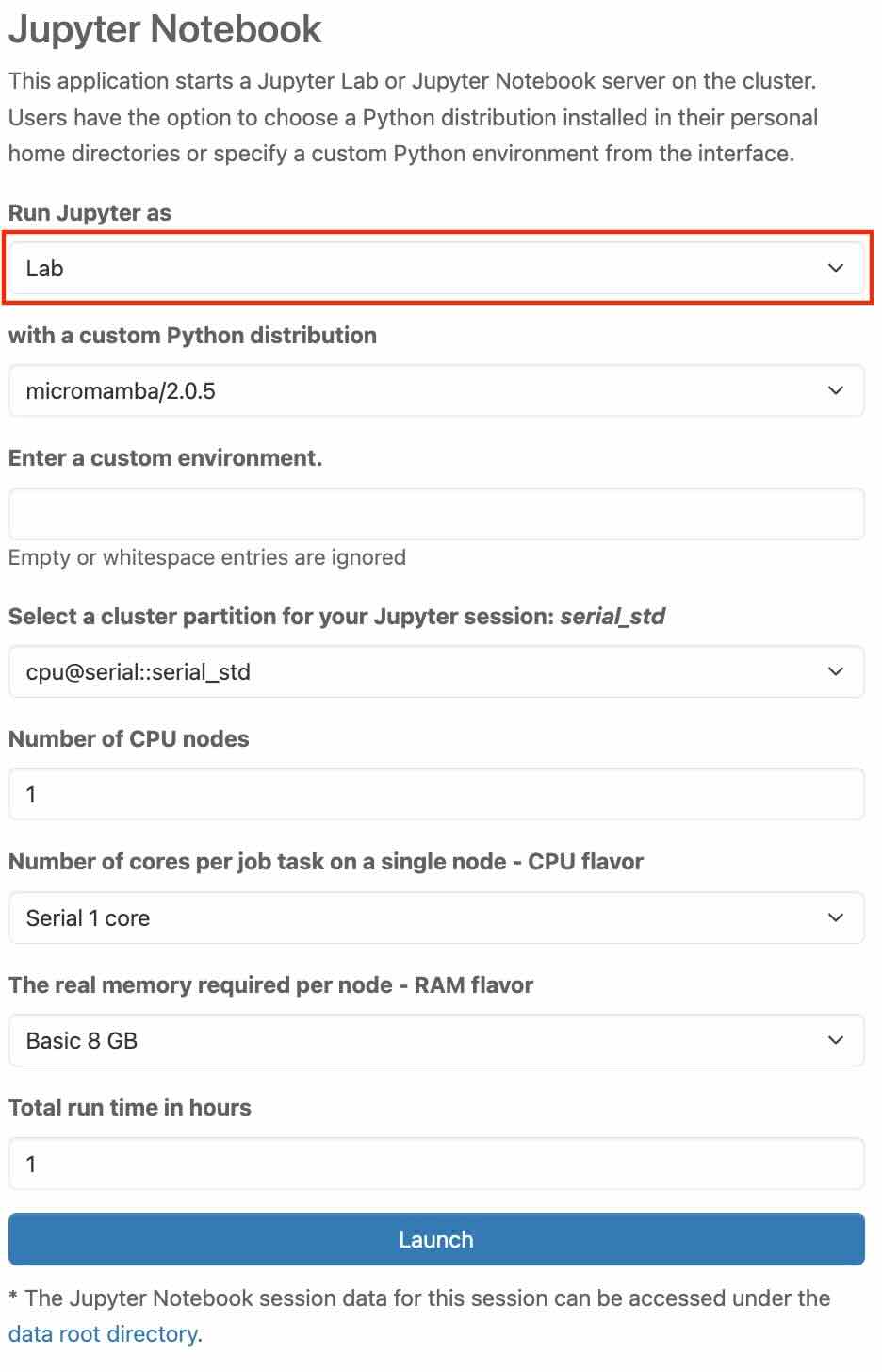 In this section, you choose how to run Jupyter. You can run Jupyter as either “Lab” or “Notebook”.