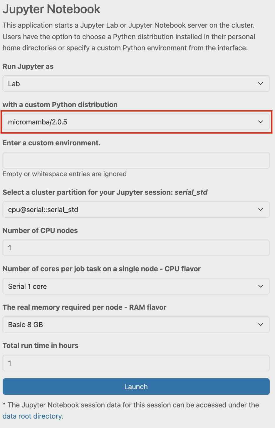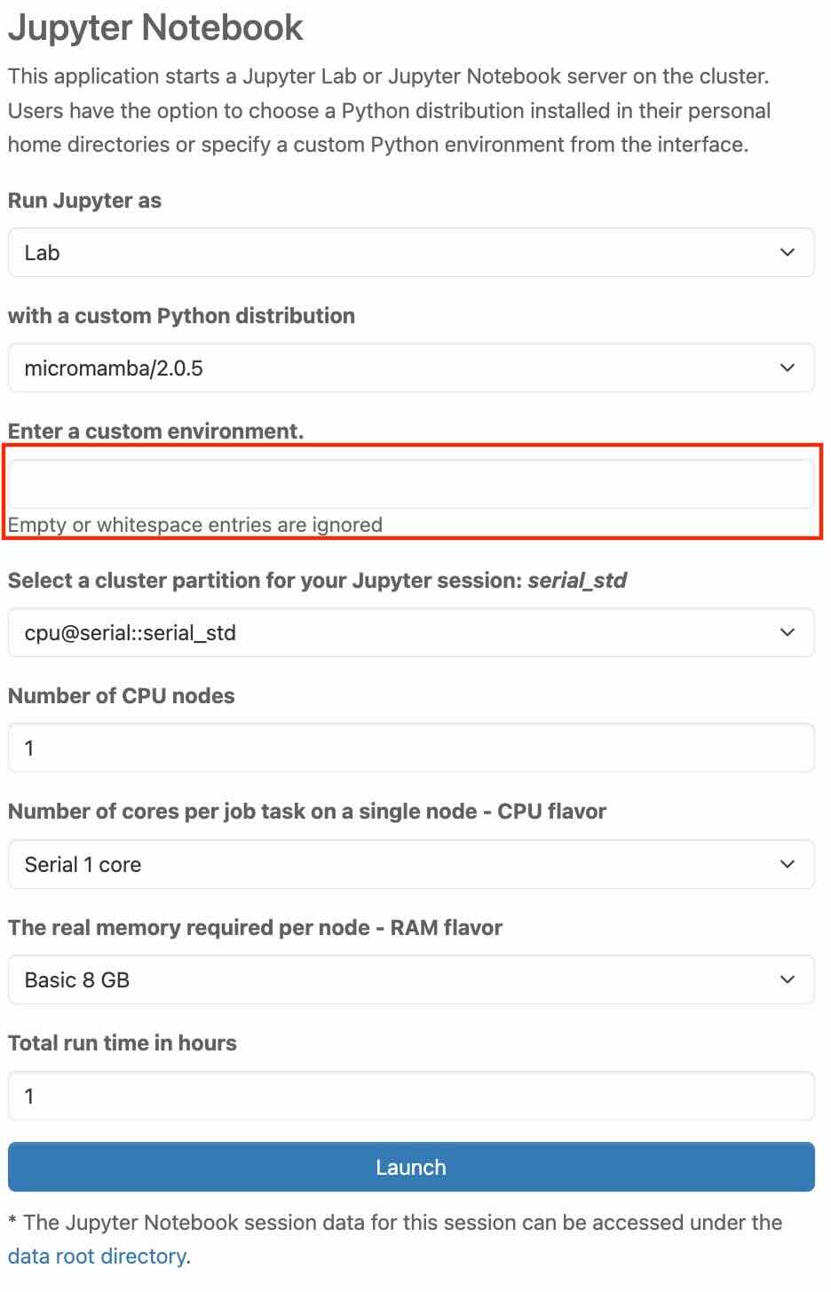 In the "Enter a custom environment", you have the possibility to enter the name (or path) of your environment that you previously created in your home folder. For new environment creation, we strongly recommend using Micromamba over Conda. Micromamba acts as a direct substitute for Conda (replace 'conda' with 'micromamba' in commands) while providing significantly faster installation, especially for complex environments. It utilizes the conda-forge repository, granting access to all available conda-forge packages.