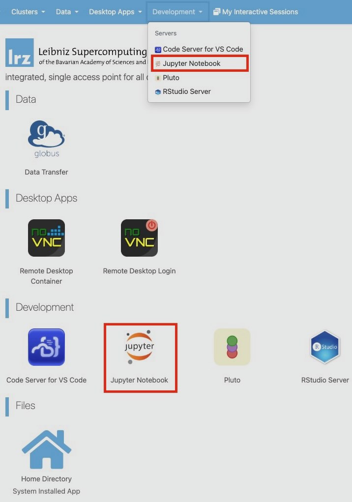 Jupyter Notebook can be accessed by selecting it from the drop-down list under the Development section in the upper menu bar, or by clicking the Jupyter Notebook icon on the dashboard.