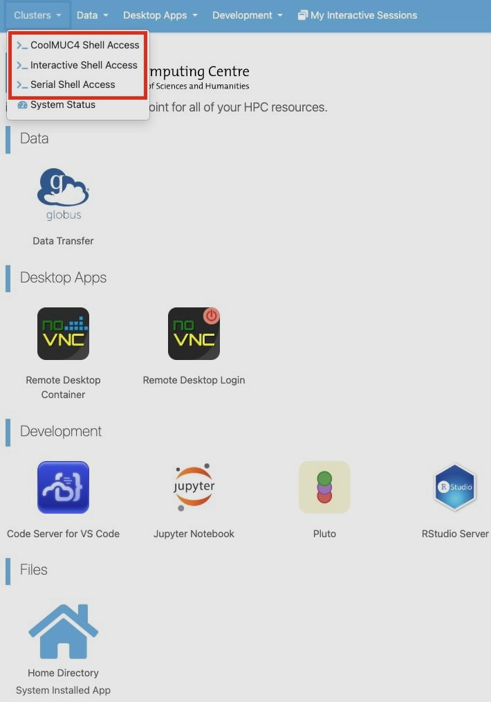 A terminal with a shell on the login node can be opened in the browser. You can select one of the Linux cluster shells, including CoolMUC4, Interactive, and Serial Shell, from the drop-down list under Clusters in the upper menu bar.