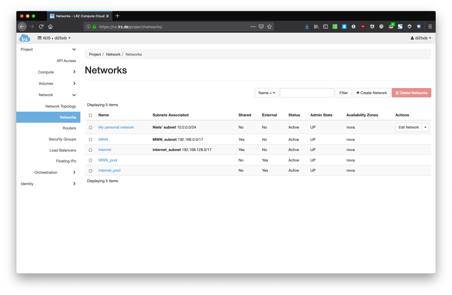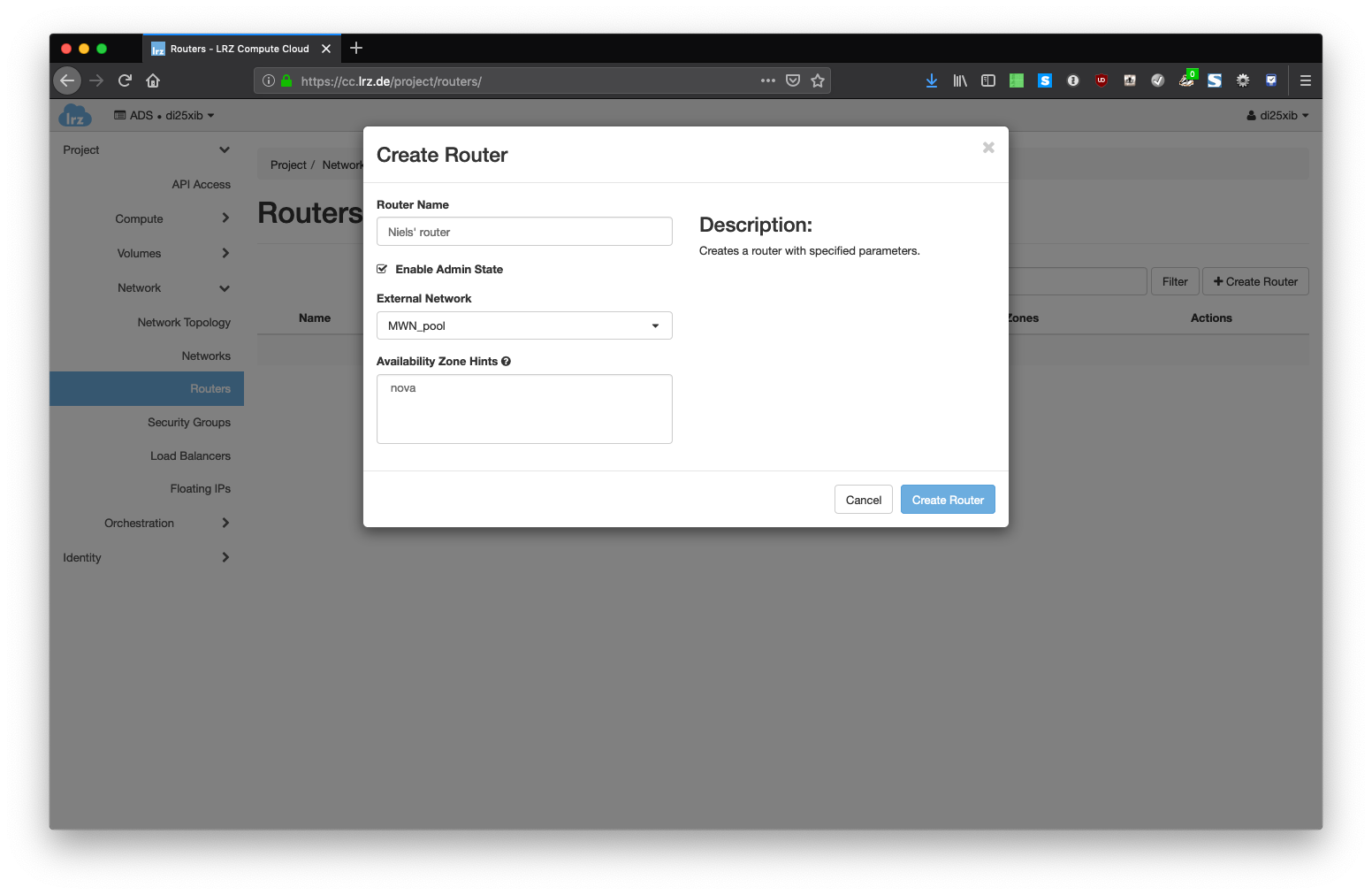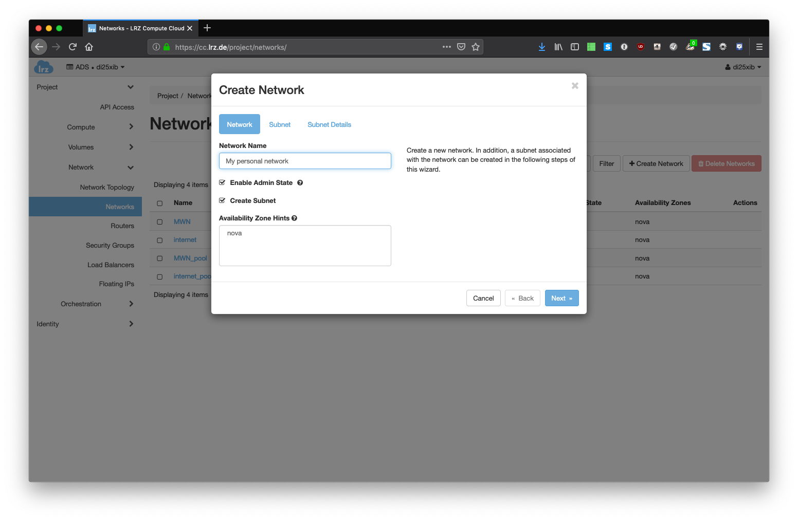 - At this point, you have a personal network that is connected to the outside world via a router routing the traffic through a network provided by LRZ. You can now attach this network to your virtual machines when you create new VMs as described by another tutorial.