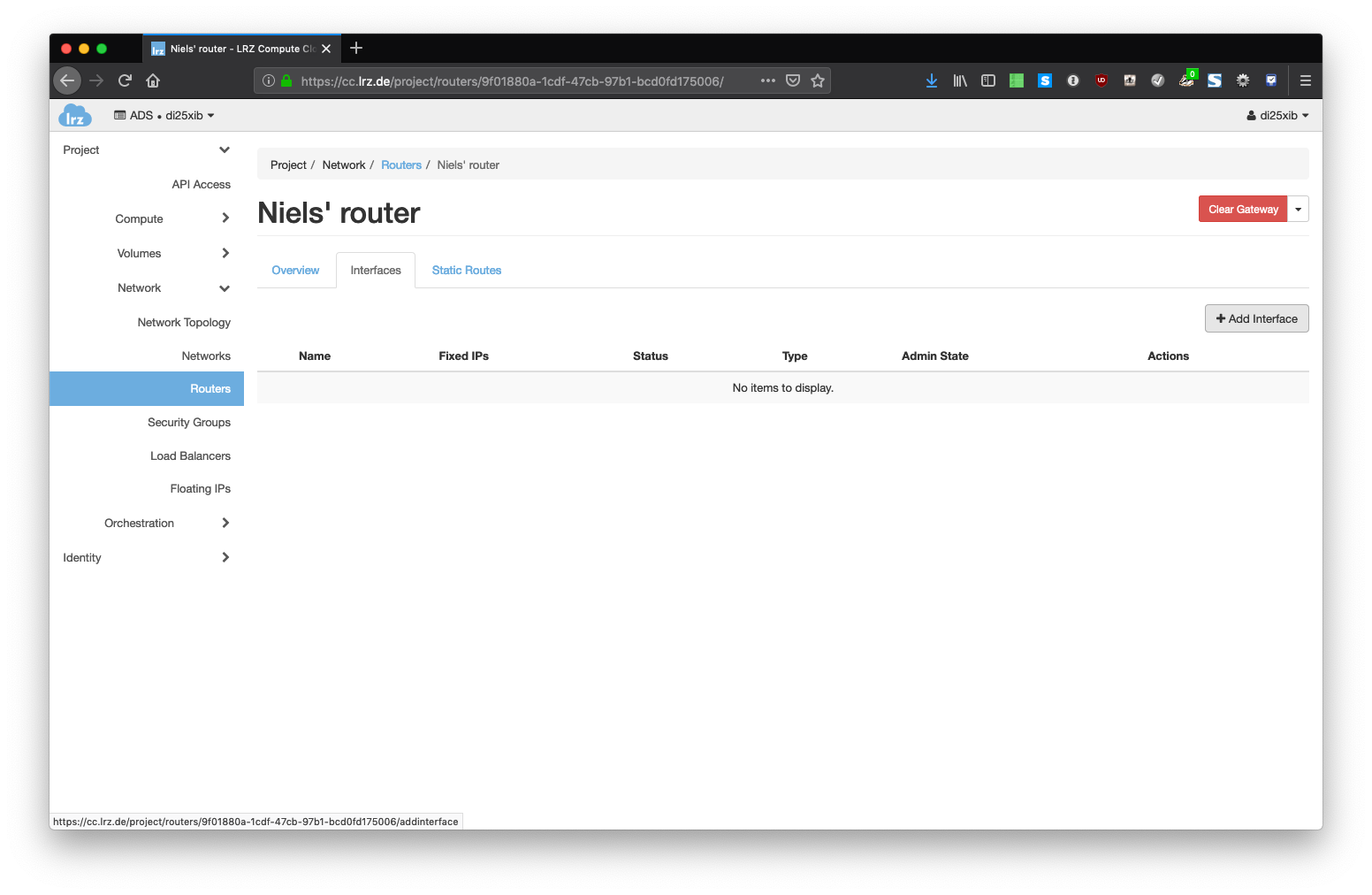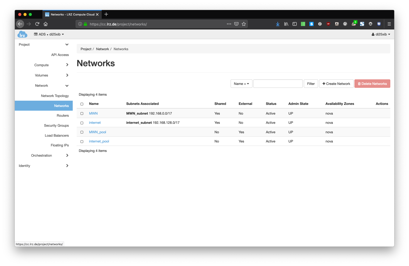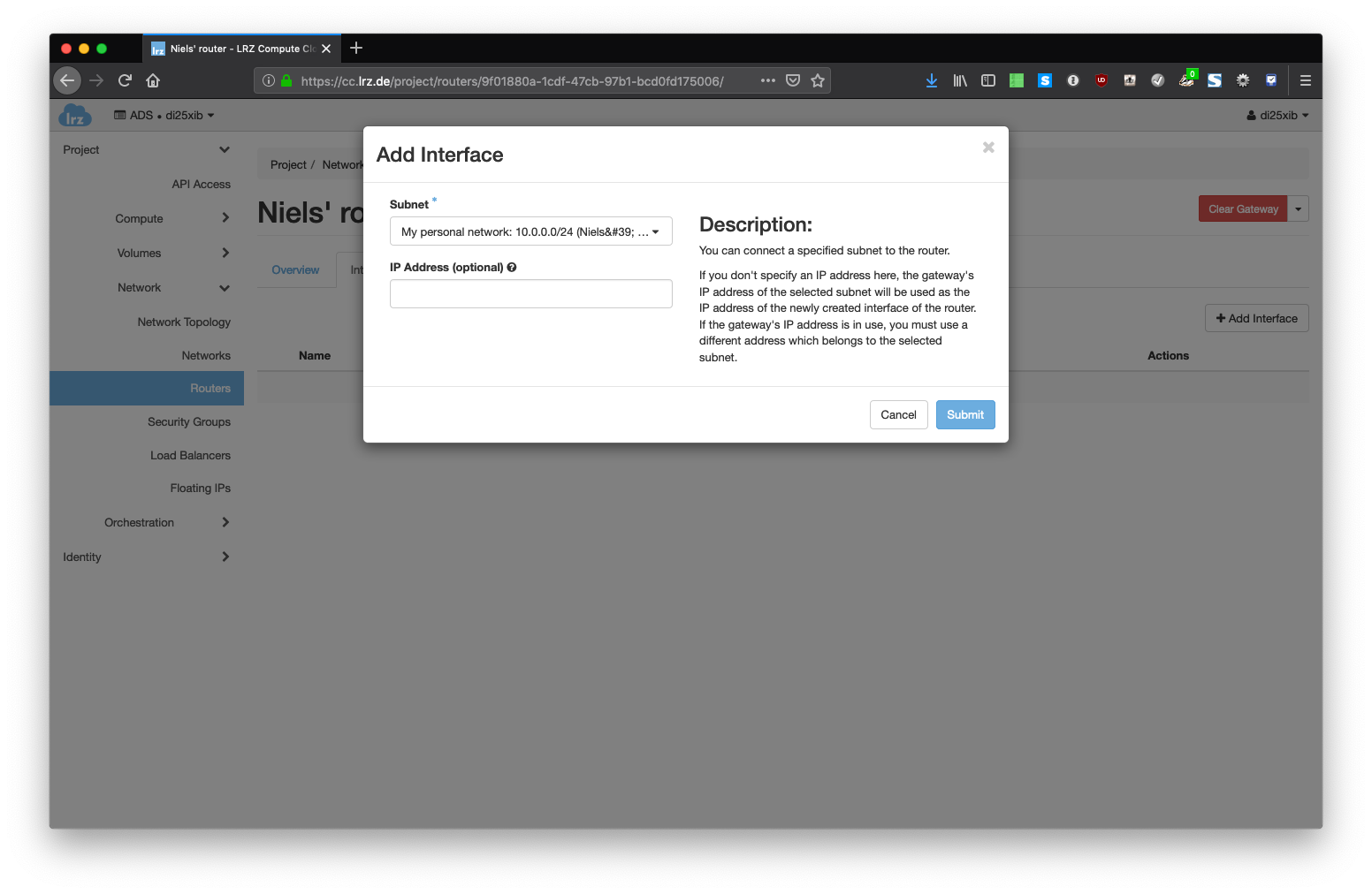 - At this point, you have a personal network that is connected to the outside world via a router routing the traffic through a network provided by LRZ. You can now attach this network to your virtual machines when you create new VMs as described by another tutorial.