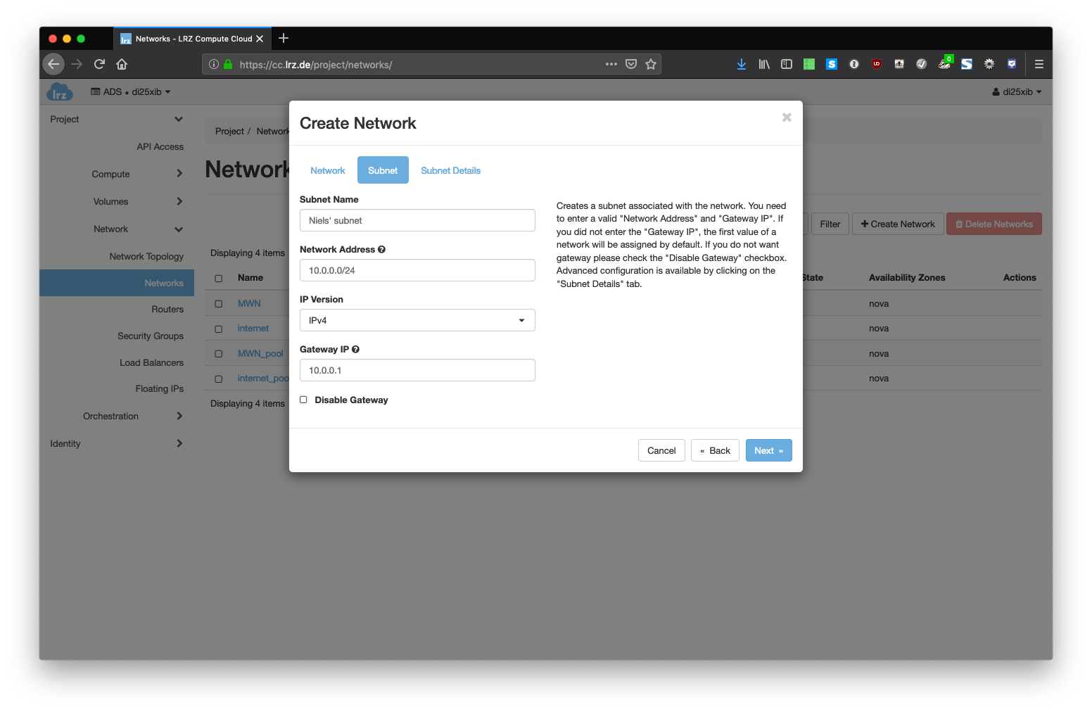 - In the Subnet tab you need to provide a subnet name (you can freely choose a name you want), a network address in CIDR format (like 10.0.0.0/24), the IP Version (only IPv4 is supported for the moment and a gateway IP for the VMs in this network, which is usually the first IP in your subnet, e.g. 10.0.0.1.