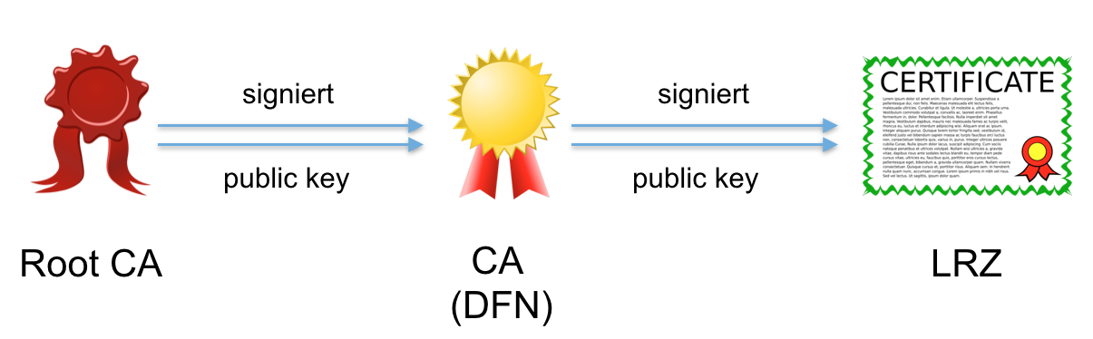 Um das Vertrauen in diese zu gewährleisten, gibt es übergeordnete, bekannte, und damit als letztendlich vertrauenswürdig angesehene Zertifizierungsstellen (z.B. DFN, Symantec), die ihrerseits ein Zertifikat einer CA signieren. Diese bezeichnet man als Root-Certification Authority (Root CA).