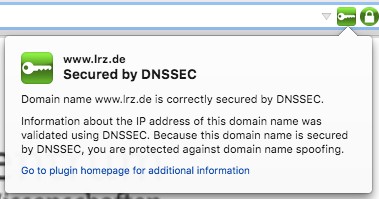 Ein grünes Schlüsselsymbol deutet die korrekte DNSSEC-Validierung der Nameserverabfrage an, und ein grünes Vorhängeschloßsymbol bedeutet, dass ein dem Zertifikat entsprechender TLSA-Eintrag gefunden wurde.