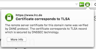 Von Drittanbietern gibt es ein freies Addon sowohl für Mozilla Firefox, Google Chrome und den Microsoft Internet Explorer auf der DNSSEC/TLSA Validator Seite. Das Addon fügt in die Adressleiste Symbole hinzu, die den DNSSEC-Status der Nameserver-Abfrage und den TLSA-Eintrag zu einem Zertifikat anzeigen (siehe Abbildung).